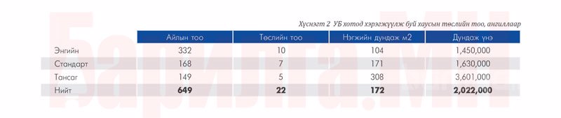Улаанбаатар хотын хэмжээнд энгийн 332 айлын 10 төсөл, стандарт 168 айлын 7 төсөл, тансаг зэрэглэлийн 149 айлын 5 төсөл захиалга авч байна. Үнэ ханшийн тухайд энгийн зэрэглэлийн орон сууцны дундаж үнэ 1,4 сая, стандарт төсөл 1,6 сая, тансаг зэрэглэлийн хаус 3,6 сая төгрөг байна.