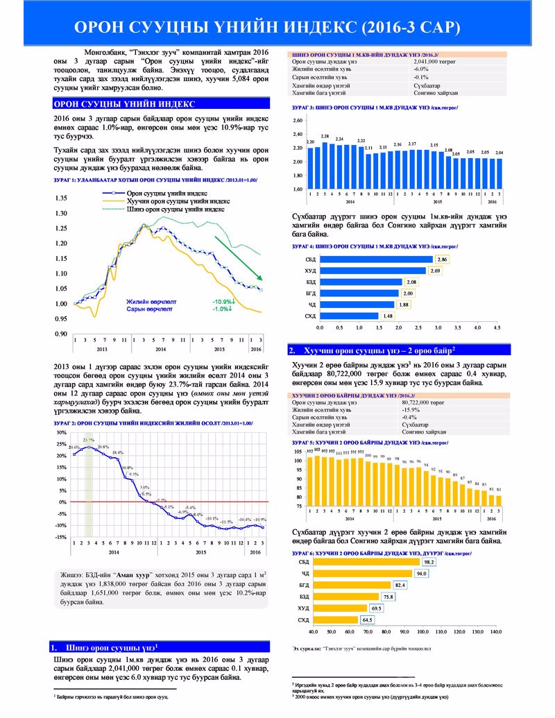Монгол банкны захиалгаар Үл хөдлөх хөрөнгийн Тэнхлэг зууч компанийн хараат бусаар хийсэн гуравдугаар сарын “Орон сууцны үнийн индекс”-ийн судалгааг танилцууллаа. ОСҮИ-ийг Хедоник регрессийн аргаар тооцоолсон бөгөөд энэхүү тооцоололд тухайн сард Улаанбаатар хотод борлуулагдахаар зах зээлд нийлүүлэгдсэн шинэ, хуучин нийт 5084 орон сууцны мэдээллийг хамруулжээ. Судалгаагаар ОСҮИ 4.5 хувьтай гарлаа. Энэ нь өмнөх сараас -0.9 хувиар буурсан бол өнгөрсөн оны мөн үетэй харьцуулахад -10.9 хувиар буурчээ.