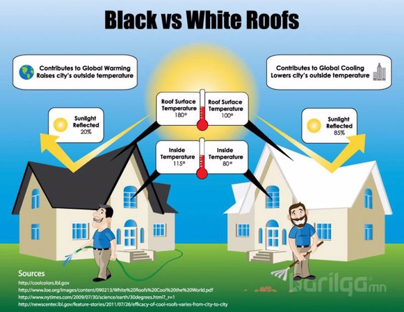 Дээврийн ус тусгаарлалтын материал нь нарны хэт ягаан туяанд илүүтэйгээр гэмтэж барилгад муугаар нөлөөлдөг. Мөн Европын Барилгын хөгжлийн газраас гаргасан судалгаагаар барилгын дээвэр цагаан өнгөтэй байх нь хотын цаг агаарт эерэг сайн талтай. Учир нь цагаан өнгө нарны гэрлийн 80 хувийг буцааж ойлгодог бол, хар цаасан дээвэрт туссан нарны гэрлийн 80 хувь барилгад шингэж, 20 хувь нь хотын уур амьсгалд сөргөөр нөлөөлдөг нь тогтоогджээ. Тиймээс үүнийг COOL ROOF SYSTEM гэх болсон байна. Энэ сэдвээр Олон Улсын Семинар, зөвлөгөөнүүд тогтмол зохион байгуулагдаж, томоохон хот, суурингуудын барилгын дээврийг цагаан өнгөтэй эсвэл эко дээвэр болгох уриалга дэлхий даяар түгж байгаа билээ. Уриалгын гол агуулгыг нь дэлхийн дулаарлын эсрэг хэрэгжүүлж буй хүн төрөлхтний бодит алхам гэж үзэж байгаа аж.