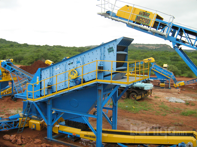 Зураг 2. Хоёр үе шаттай чичиргээт шигшүүр. Эхлээд бетон, тоосго болон мод зэргийг шорооноос шигшиж ялгана. Эхний шигшүүрээс гарсан хэсгийг хоёрдох руу нь зөөж дараагийн шигшүүрээр шигшинэ. Сүүлийн шигшүүрээс гарсан бүтээгдэхүүнийг дахин ашиглахаар нөөцөлнө.