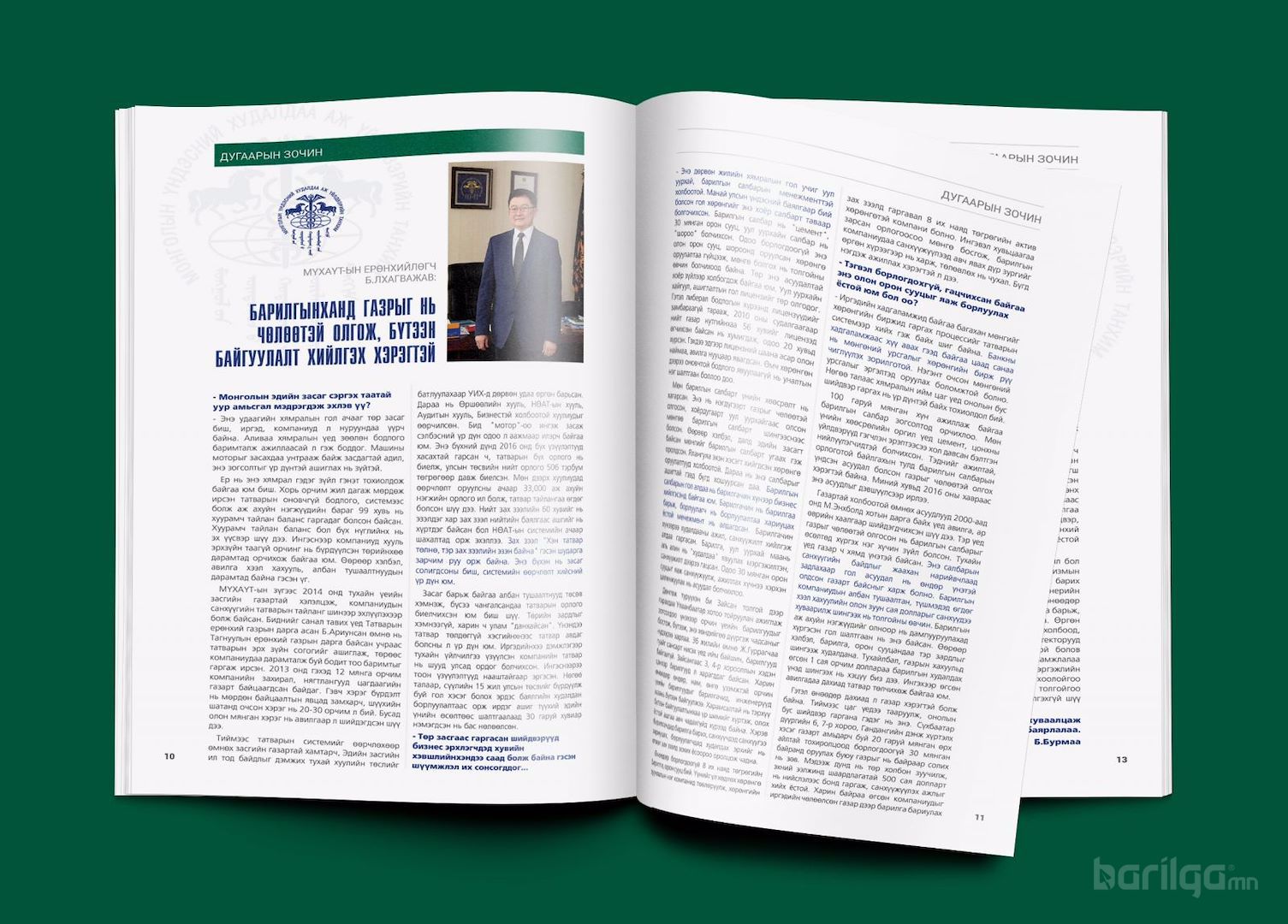 Харин энэ сарын дугаарын онцлох ярилцагчаар МҮХАҮТ-ын Ерөнхийлөгч Б.Лхагважав гуайг байлаа. Б.Лхагважав гуай бол хувиараа бизнес эрхлэгчдийн дэмжигч, тэднийг төрд холбогч, туслалцаа үзүүлэхийн төлөө мэрийн ажилладаг эрхэм юм. Тэрээр барилгын салбарынхантай маш ойр, тулж ажилладаг бөгөөд “газрыг чөлөөтэй олгож, бүтээн байгуулалт хийлгэх хэрэгтэй” гэсэн байр суурин дээр хатуу зогсдог, үүнийхээ төлөө хувийн хэвшлийнхэнд ямар заавар, зөвлөмж өгсөн тухай уншаарай.