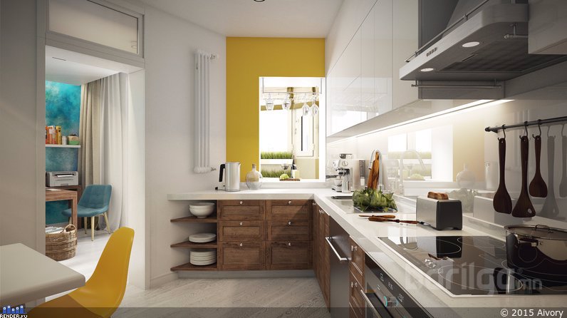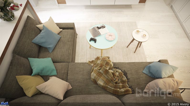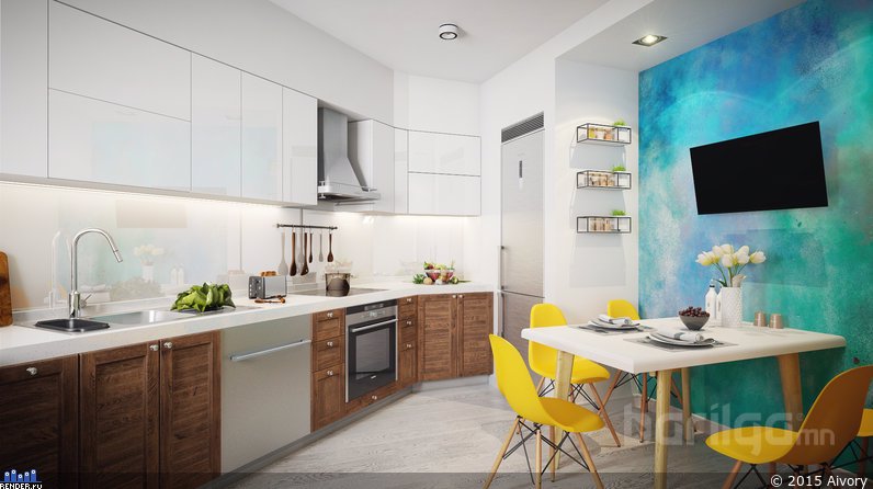 Залуу гэр бүлд зориулсан учраас даруухан бөгөөд өнгөлөг, эрч хүчийг харуулах гэж зорьсон. Зочны өрөөнд гол төлөв цэнхэр, шар өнгийг хослуулсан нь тус интерьерийн гол шийдэл юм. Тавилга, эд зүйлс бүрд энгийн даруу байдлыг баримталсан.