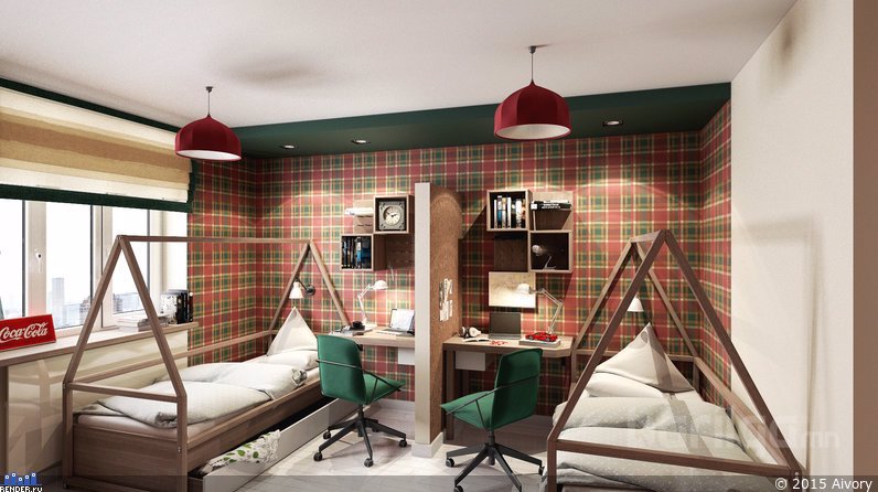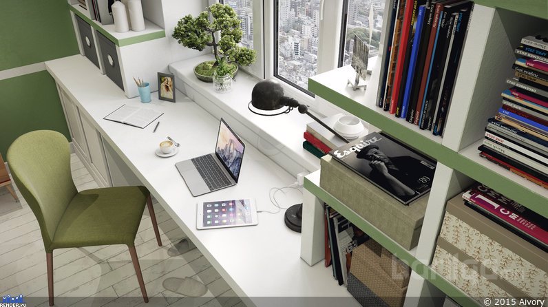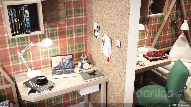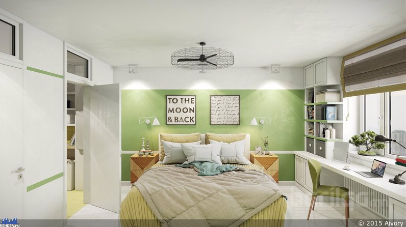 Унтлагын өрөөг амар тайван байдлын билэгдэл ногоон өнгөөр засаж, мөн л элдэв хээнцэр хэв маяггүй даруухан тавилгуудыг сонгосон. Зай, талбайг хэмнэх үүднээс цонхны наана тавцан бүхий ширээ болон шүүгээг байрлуулжээ.