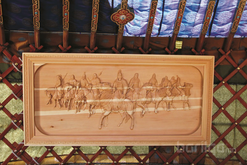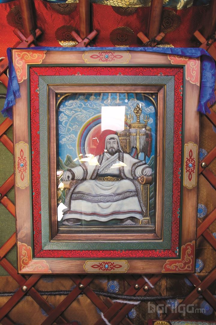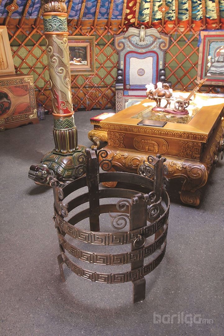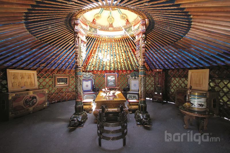 Гэрийн тавилга, эдлэл нь хоорондоо гайхалтай зохицсон нь доторх уур амьсгалыг илүү чамин болгож байна. Тавилга бүр утга төгс бүхий чимэглэлтэй. Хойморт бүргэд толгойтой хаан суудал, тогос толгойтой хатан суудал мөн Чингис хааны хөрөг зургийг байрлуулжээ.