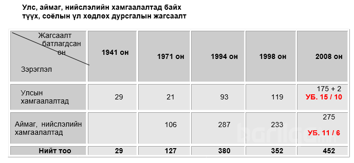 Манай улсын хувьд “Улс, аймаг, нийслэлийн хамгаалалтад байх түүх, соёлын үл хөдлөх дурсгалын жагсаалт”-ыг 1994 онд батлахдаа олон улсын жишгийн дагуу түүх, урлаг, шинжлэх ухааны үнэ цэнэ, ач холбогдлыг харгалзсанаас гадна түүхэн цаг хугацааг өөрийн орны онцлогт тохируулан 1924 оноос өмнө баригдсан уран барилга, түүхийн дурсгалт барилга байгууламжийг оруулахаар эрдэмтэн, судлаач, мэргэжилтний оролцсон Мэргэжлийн зөвлөлөөр тогтсон билээ.
