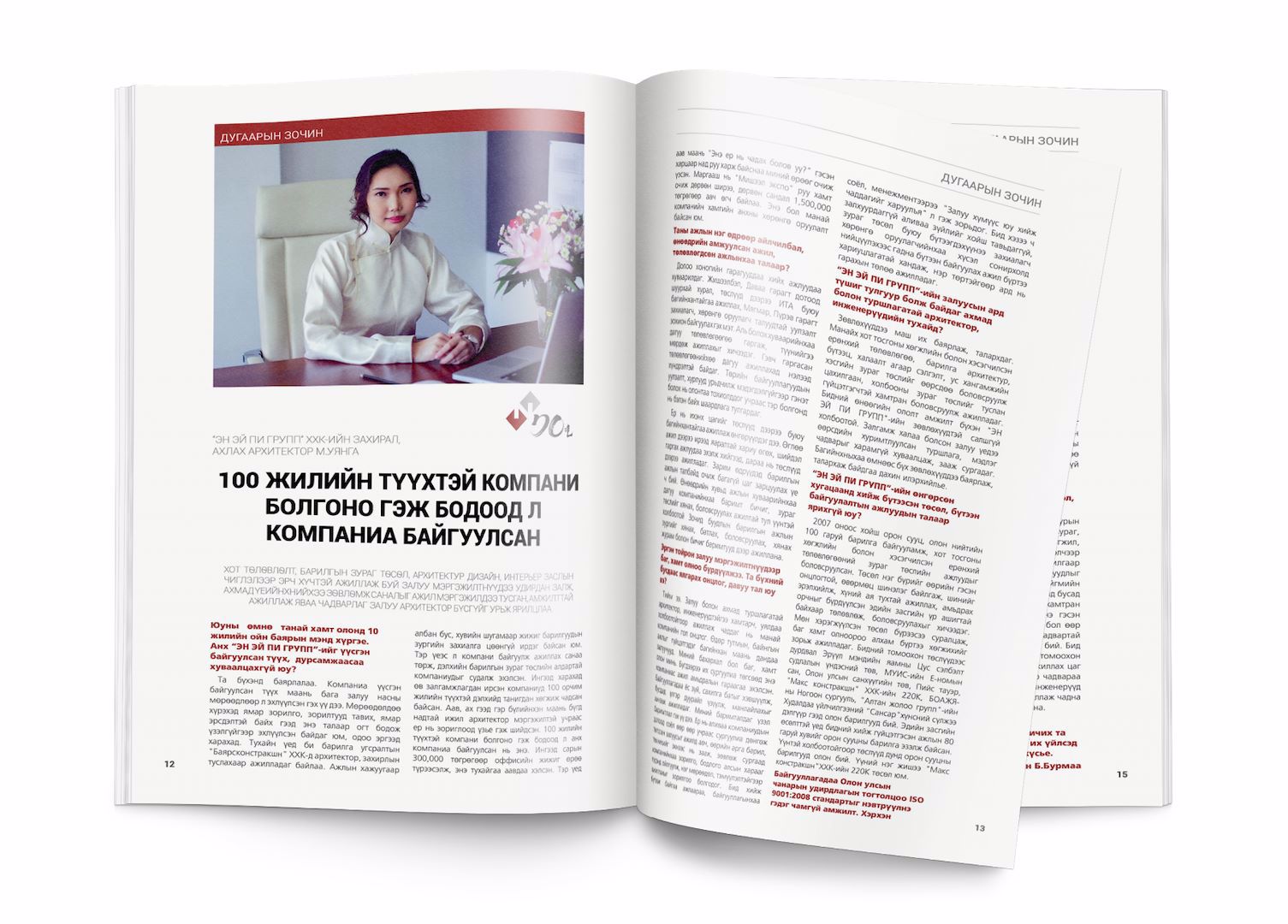 Сэтгүүлийн энэ удаагийн дугаарын зочноор үүсэн байгуулагдаад 10 дахь жилийнхээ ойн баярыг тэмдэглэж буй хот төлөвлөлт, барилгын зураг төслийн “ЭН ЭЙ ПИ ГРУПП” ХХК-ийн Захирал, ахлах архитектор М.Уянгыг урьж, залуу архитектор бүсгүйн ажиллах арга барил, түүний үзэл бодлыг хуваалцан ярилцлаа.