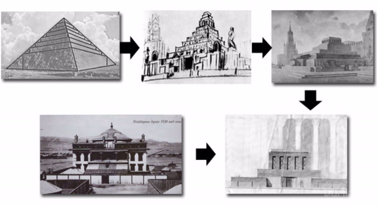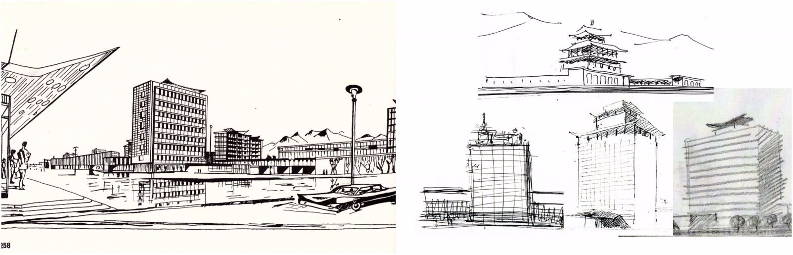Зураг 4. Зүүн талын зураг: 1972 оны Д.Майдар гуайн “Монголын архитектур ба хот байгуулалт” номонд хэвлэгдсэн зураг (хэний бүтээл нь бичигдээгүй). Баруун талын зураг: Б.Чимэд гуайн зурсан таталбар зургуудаас түүвэрлэсэн зураг.