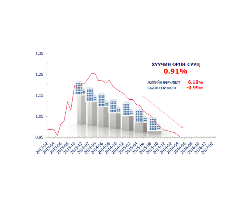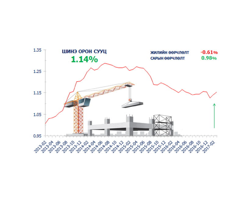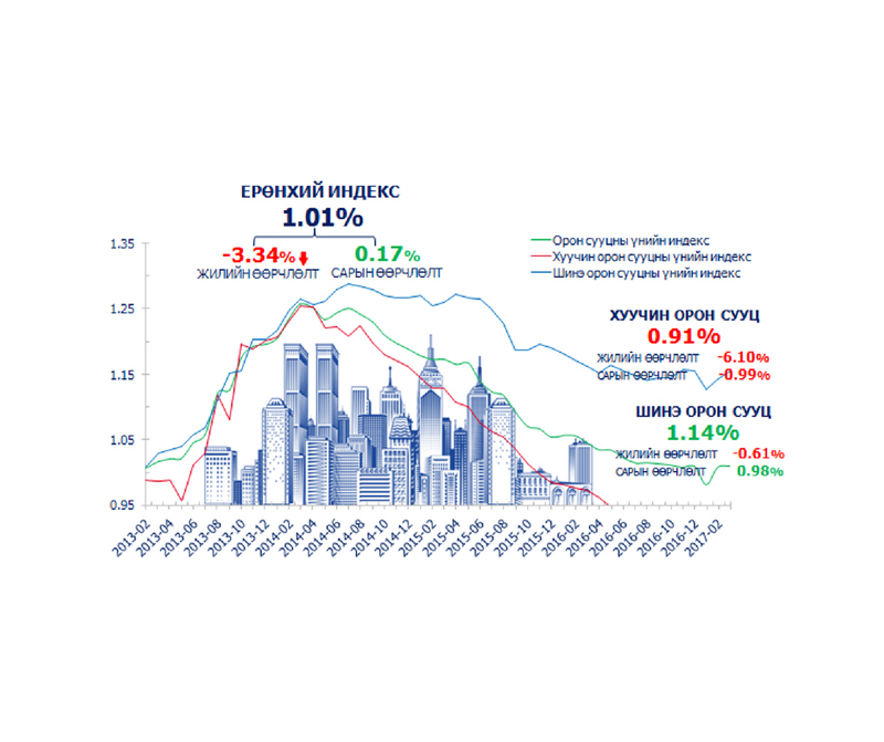 2017 оны 3 сард Орон сууцны үнийн индекс 1,01 болж суурь үе буюу 2013 оны 1 сараас 1,0 хувийн өсөлттэй гарлаа. Энэ нь өмнөх сараас 0,17 хувиар өссөн үр дүнг харуулж байна. Харин өнгөрсөн оны мөн үетэй харьцуулахад 3,34 хувиар буурчээ.