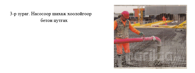 Бетон хольцыг насосоор шахаж хоолойгоор дамжуулан цутгаж бетондоход дүүргэгчийн хоолойн диаметрээс 1/3 бага ба том дүүргэгч нийт массын 15...25% байх ёстой.