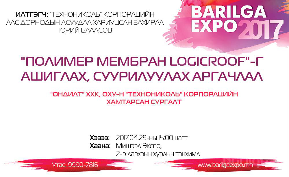 14:30-17:00 "Ондилт" ХХК, ОХУ-н "ТехноНИКОЛЬ" корпораци - "Полимер мембран LOGICROOF"-г ашиглах, суурилуулах аргачлал”