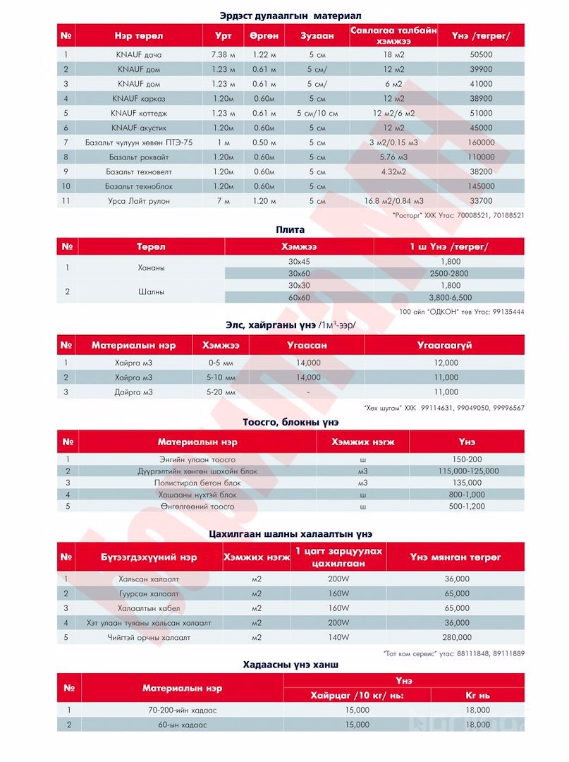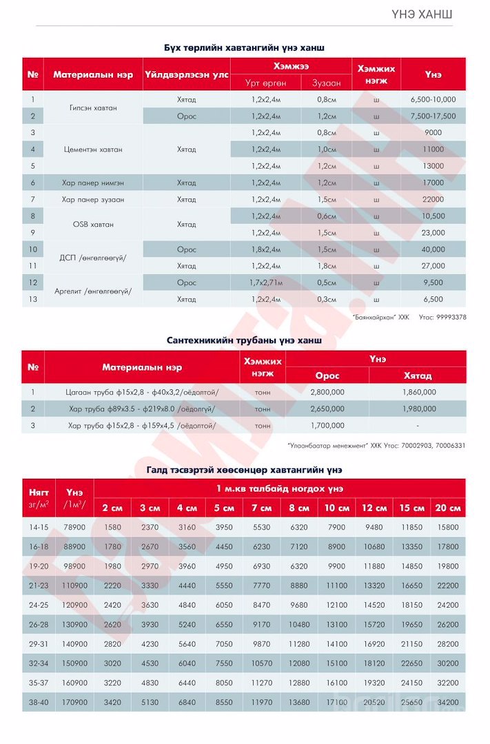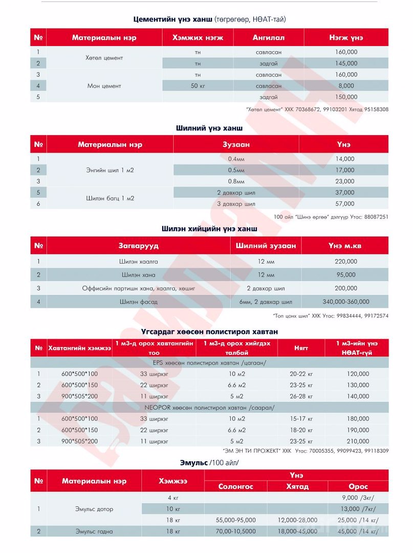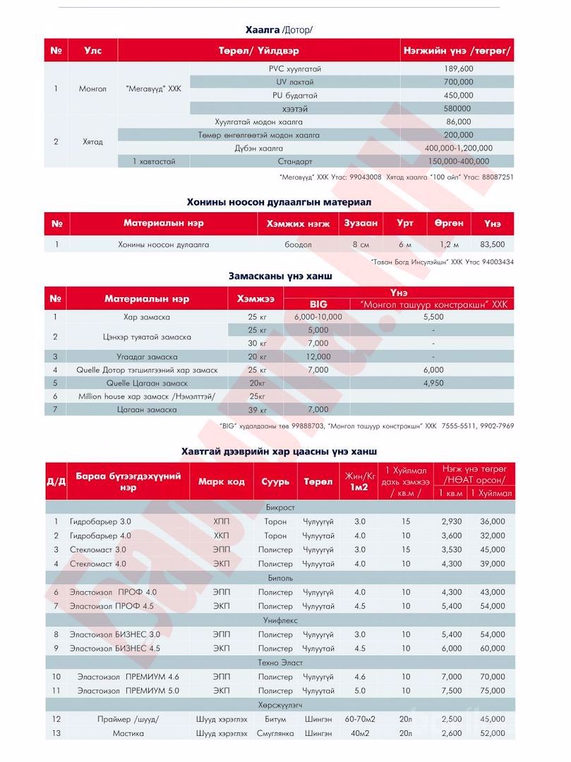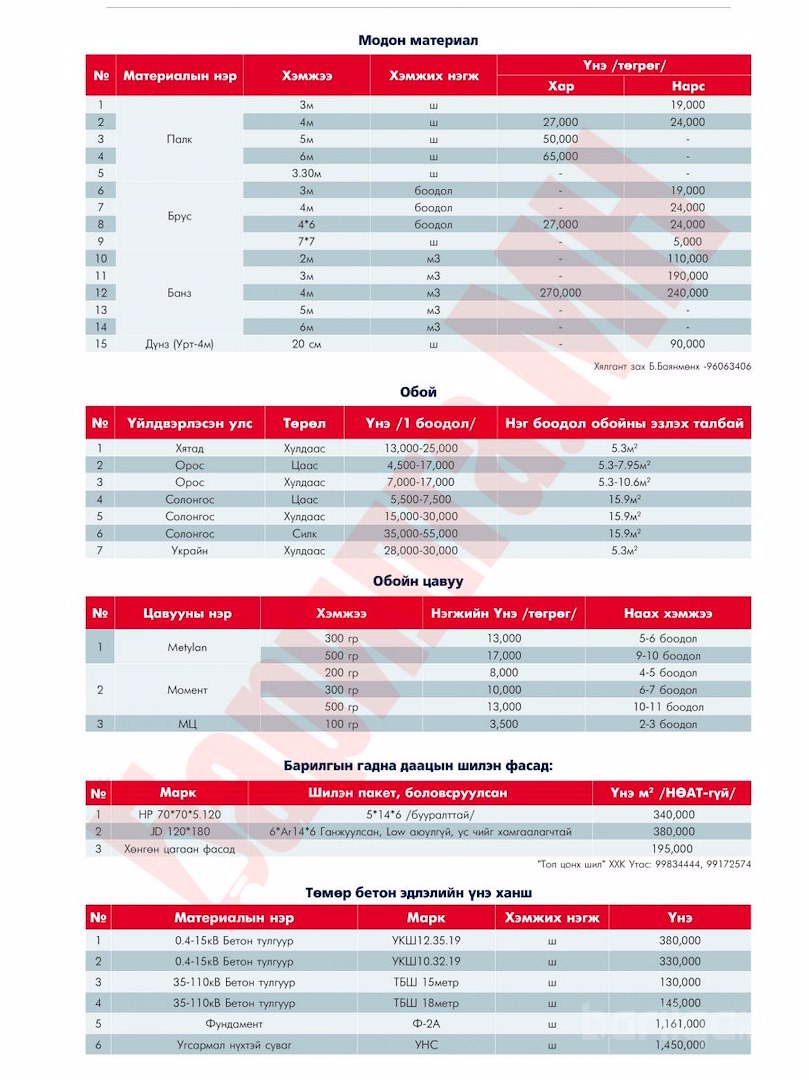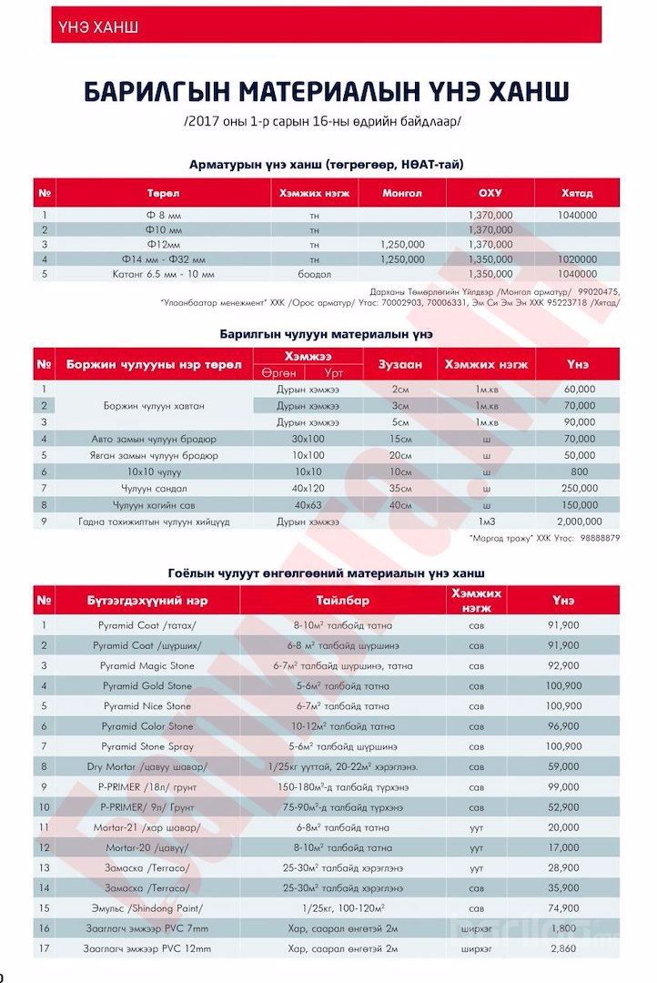 "Барилга.МН" сэтгүүлээс сар бүр хүргэдэг барилгын материалын үнэ ханшийн мэдээллийг уншигч танд хүргэж байна. Илүү дэлгэрэнгүй мэдээлэл авахыг хүсвэл манай сэтгүүлийн 2017 оны 2-р сарын дугаар №81-ээс үзэх боломжтой. "Барилга.МН" сэтгүүлийг "Номин" болон "Оргил" сүлжээ дэлгүүрийн салбарууд, номын дэлгүүрүүд, сонин сэтгүүл борлуулах цэгүүдээс худалдан аваарай. Доорх үнэ ханш нь 2017 оны 1-р сарын 25-ны өдрийн байдлаар болохыг анхаарна уу.