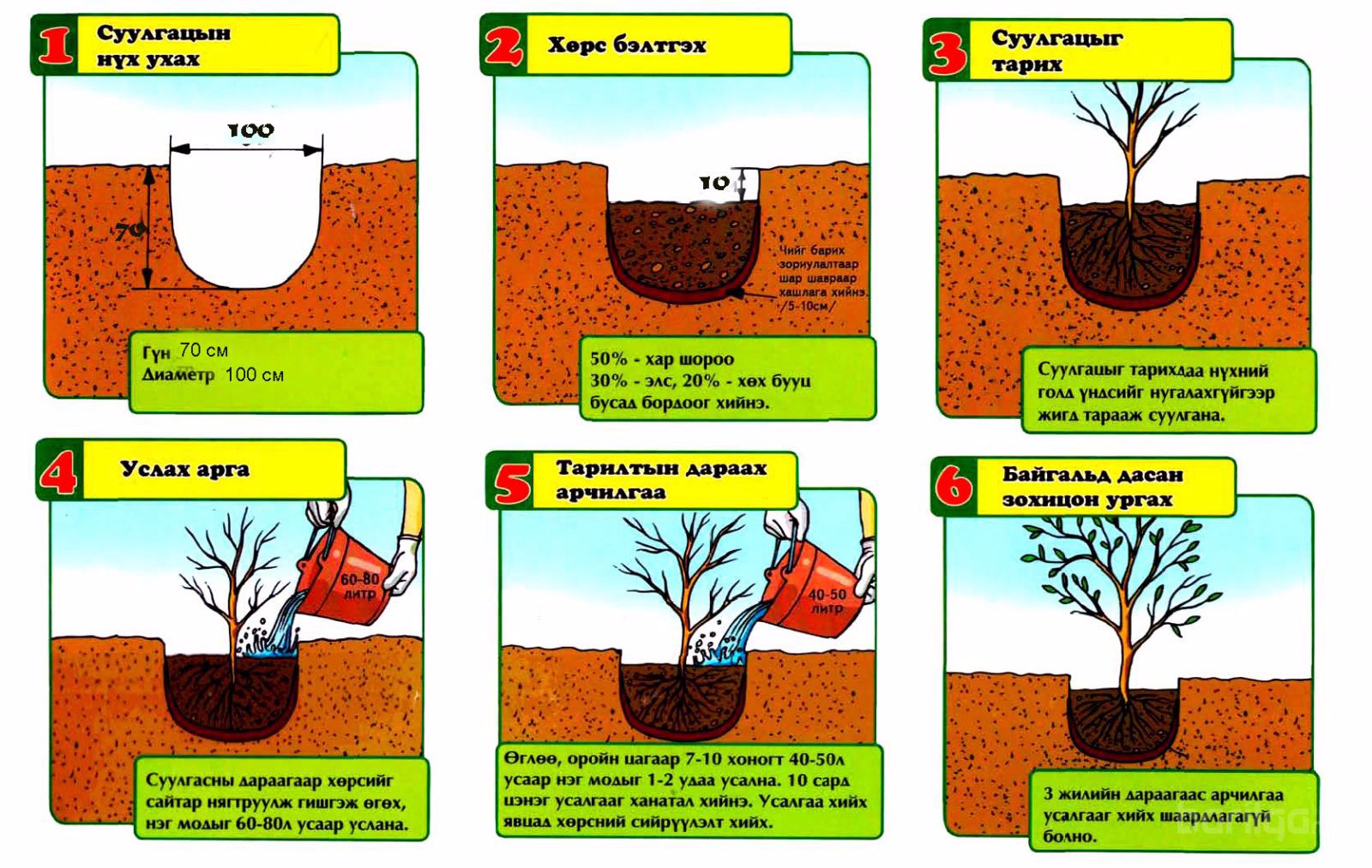 Эдгээрийг хийсний дараа мод бут сөөгөө тарих нь зүйтэй. байдаг. Иймд одоо 10 сард мод шилжүүлэх тохиромжтой хугацаа болж байна. Мод бутаа 1-2 настай суулгацыг сонгох нь зүйтэй. Үндсийг гэмтээгээгүй мөн үндэсний шороо болон үндэс өөрөө хатаагүй байгаа эсэхийг сайтар шалгах ёстой. Модны захад байдаг бол гоёл чимэглэлийн болон жимсний бут сөөг суулгавал тохиромжтой.