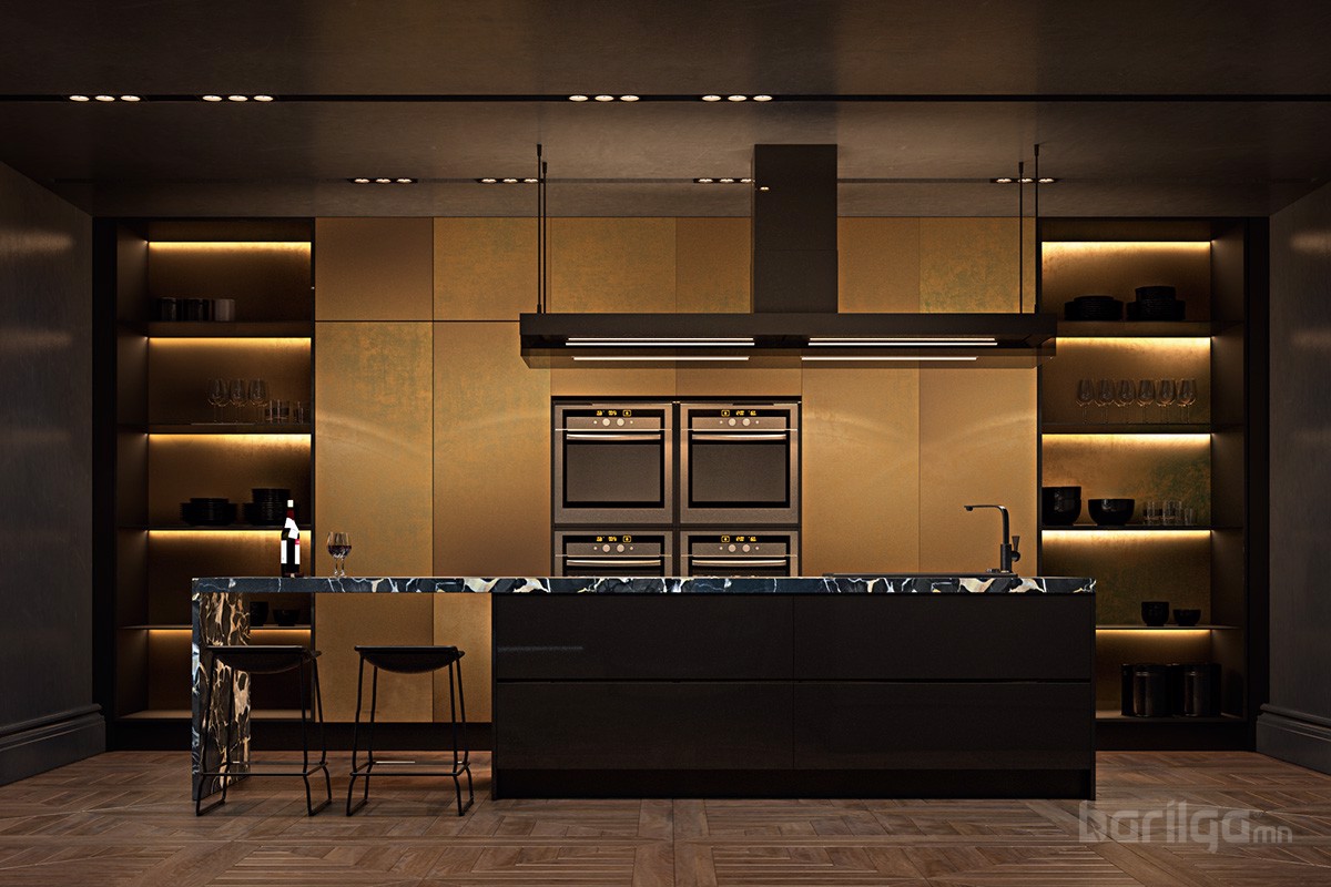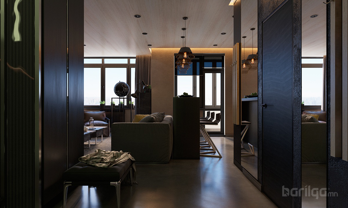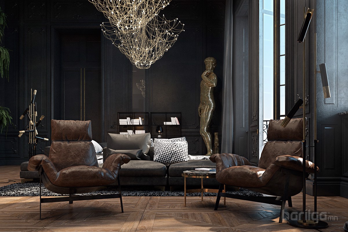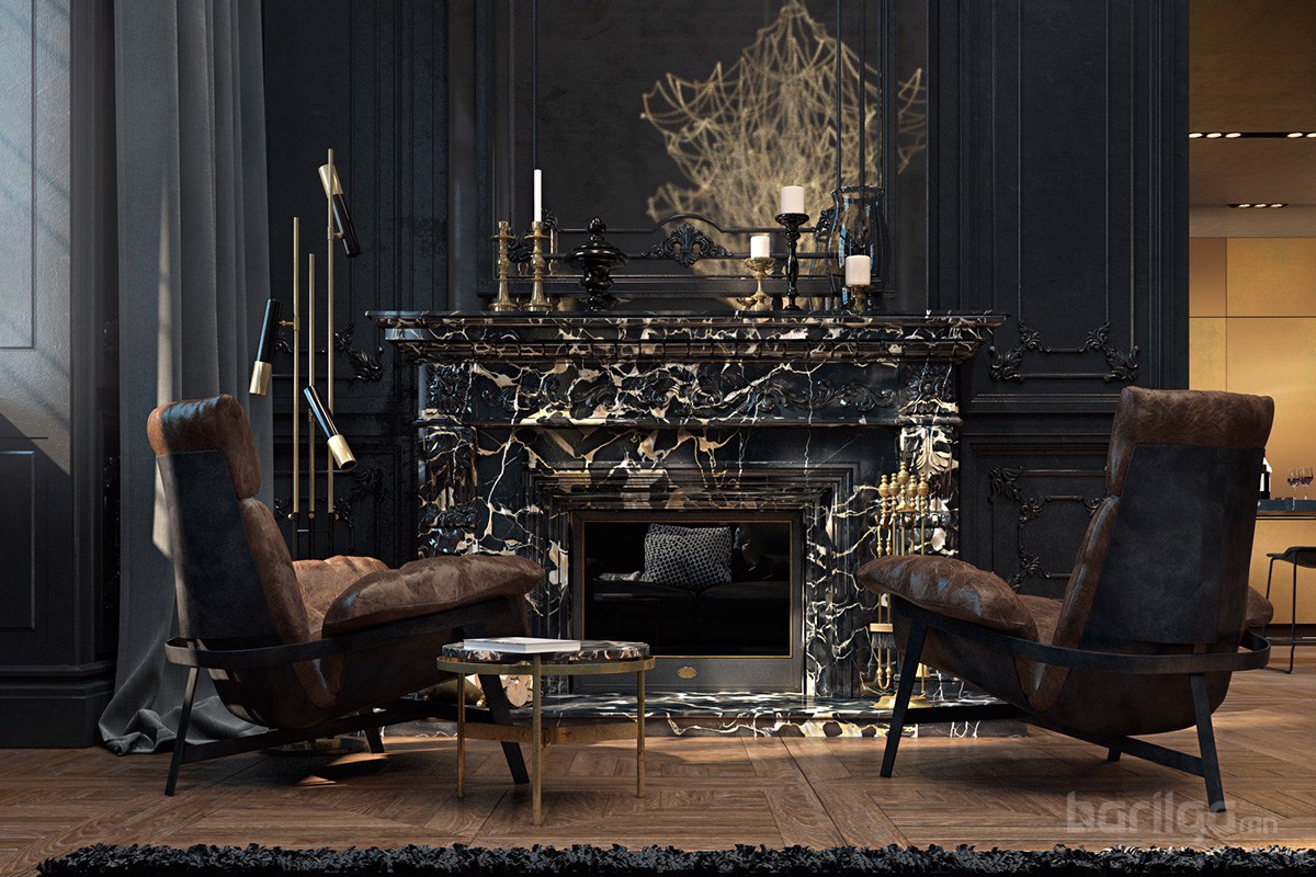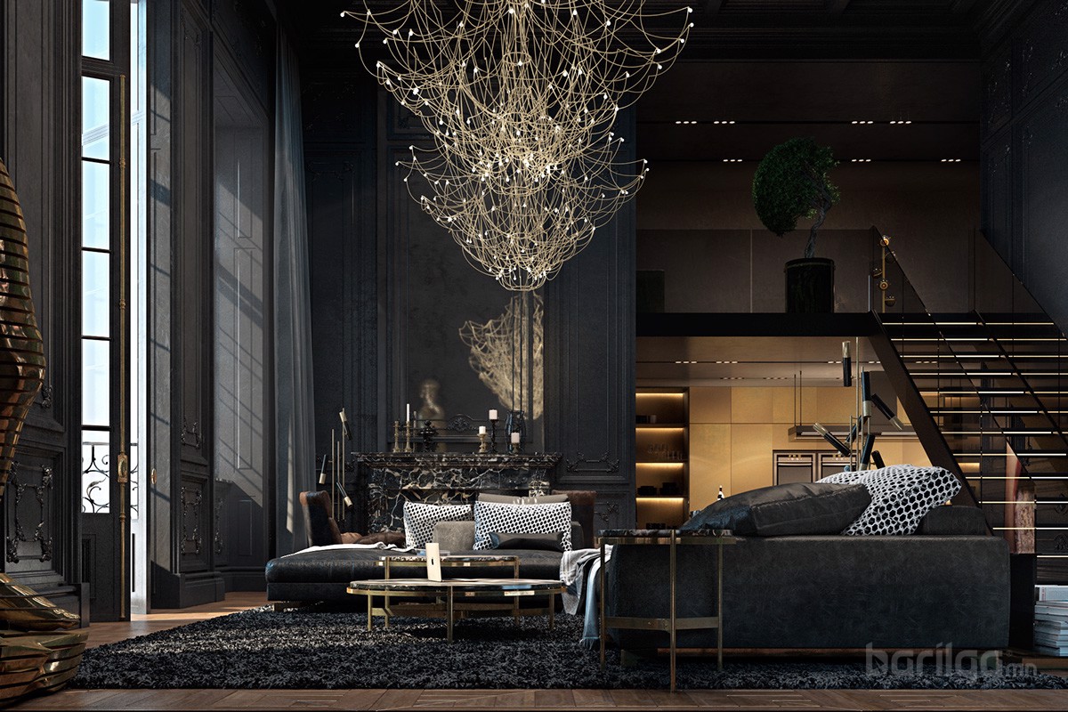 Дараах загварт хар өнгийг алтлаг шар өнгөтэй хослуулсан байх бөгөөд аалзны тор мэт гэрлийн бүрхүүл, арьс ширээр урласан буйдан, хаа нэг харагдах лаа зэрэг нь үнэхээр гайхалтай, жинхэнэ классик хэв маягийг үүсгэсэн байна.