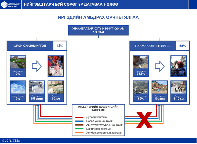 - Мөн Гэр хорооллын нутаг дэвсгэрийг нэгдсэн зохион байгуулалтад оруулж, инженерийн хангамжийг хүргэснээр газар, үл хөдлөх хөрөнгийн үнэ цэнэ нэмэгдэж, эдийн засгийн эргэлтэд орох нөхцөл боломж бүрдэнэ. Улмаар дагуул хот, тосгоны хөгжил түргэсэж, хотын төвийн нягтаршил буурах, жижиг дунд үйлдвэрлэл кластераар хөгжих гэх мэт олон сайн талтай. Хамгийн гол нь иргэдийн эрүүл мэнд, амьдрах орчин, нөхцөлд сөрөг нөлөө үзүүлэгч агаарын бохирдол, хөрсний бохирдол зэрэгт бодитоор нөлөөлнө.