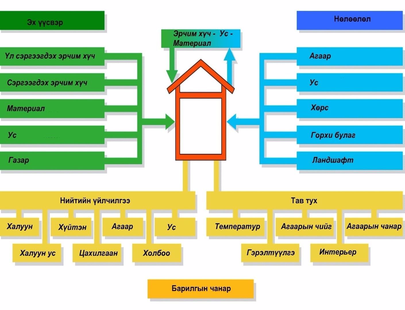 - Эрчим хүчний хувьд хэмнэлттэй, байгаль орчинд ээлтэй байх зорилгоор төлөвлөлтийн болон хийц бүтээцийн боломжит хувилбаруудыг боловсруулж, харьцуулах