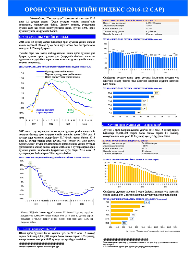 Тус судалгаагаарөнгөрсөн 12-р сард Орон сууцны үнийн ерөнхий индекс 0.93 хувьтай гарлаа. Энэ нь өмнөх сараас 0.11 хувиар өссөн үр дүн юм. Ерөнхий индексийг өнгөрсөн оны мөн үетэй буюу 2015 оны 12-р сарын үр дүнтэй харьцуулахад 4,32 хувиар буурсан байна. Харин үнийн индексийн үзүүлэлтийг шинэ орон сууц, хуучин орон сууцаар ангилж үзвэл: