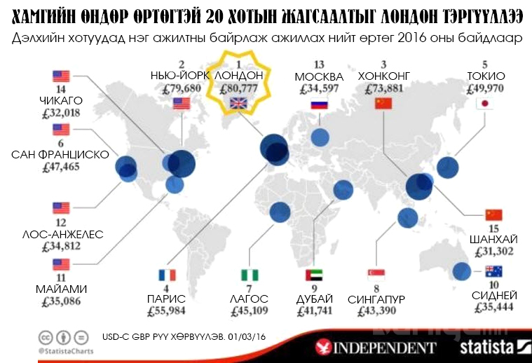 Жил тутам нэг хүнд ногдох зардал нь 80,777 фунт стерлинг байгаа Лондон хот нь 2014 оноос хойш энэхүү жагсаалтыг тэргүүлж байгаа билээ. АНУ-ын хамгийн үнэтэй 20 хотын нэг Нью-Йорк нь Лондонгийн удаах байранд оржээ. Тус хотын нэг хүнд ногдох жилийн өртөг нь 79,000 фунт стерлинг аж.