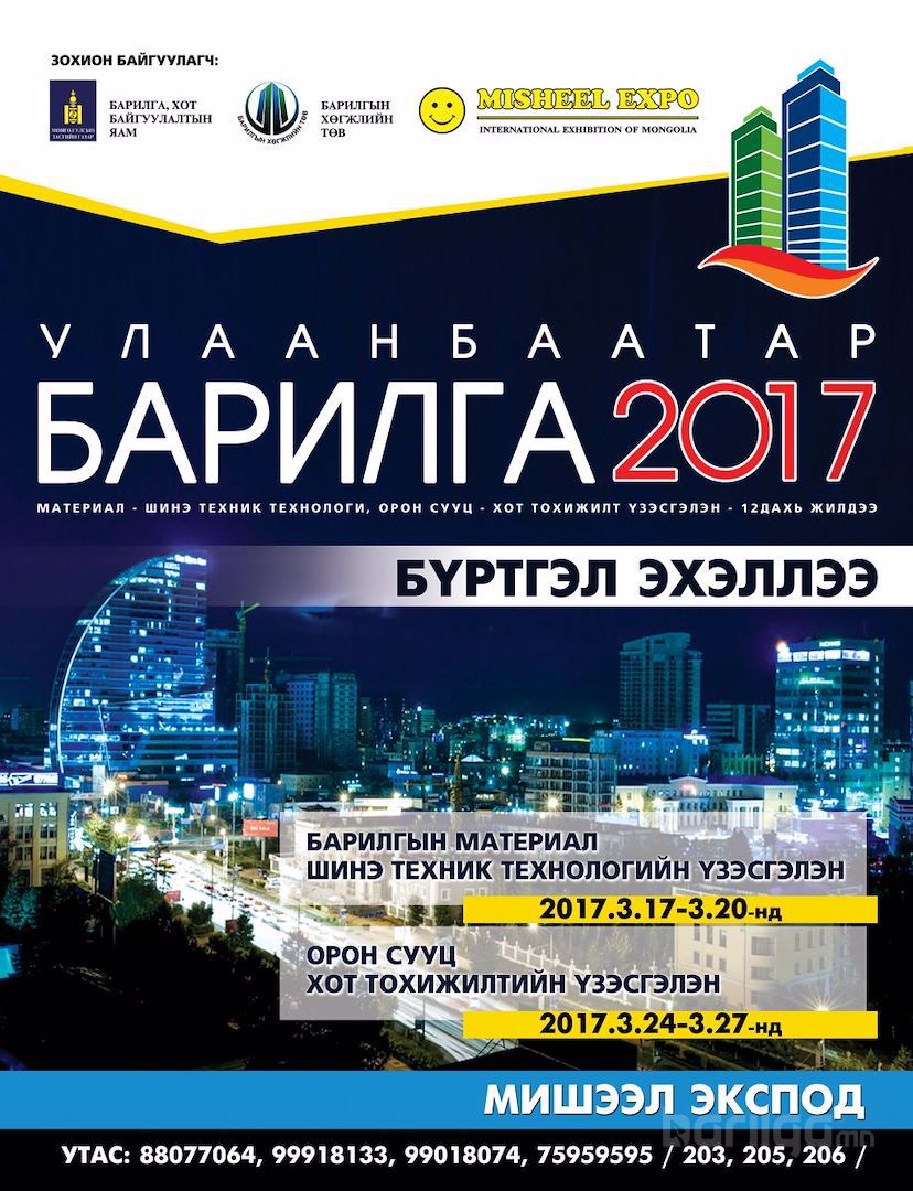 Барилга, Хот Байгуулалтын Яам, Барилгын Хөгжлийн Төв, “Мишээл Экспо” ХХК хамтран жил бүр уламжлал болгон зохион байгуулдаг “УЛААНБААТАР БАРИЛГА-2017” Барилгын материал & шинэ техник технологи үзэсгэлэн 2017 оны 3 дугаар сарын 17-ноос 3 дугаар сарын 20-ны өдрийг дуустал Орон сууц-хот тохижилт үзэсгэлэн 2016 оны 3 дугаар сарын 24-нөөс 3 дугаар сарын 27-ны өдрийг дуустал “Мишээл Экспо Төв”-д тус бүр 4 өдрийн турш зохион байгуулагдана.