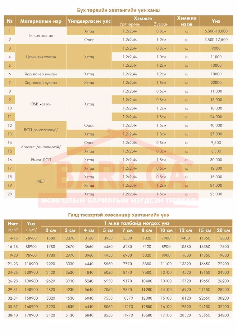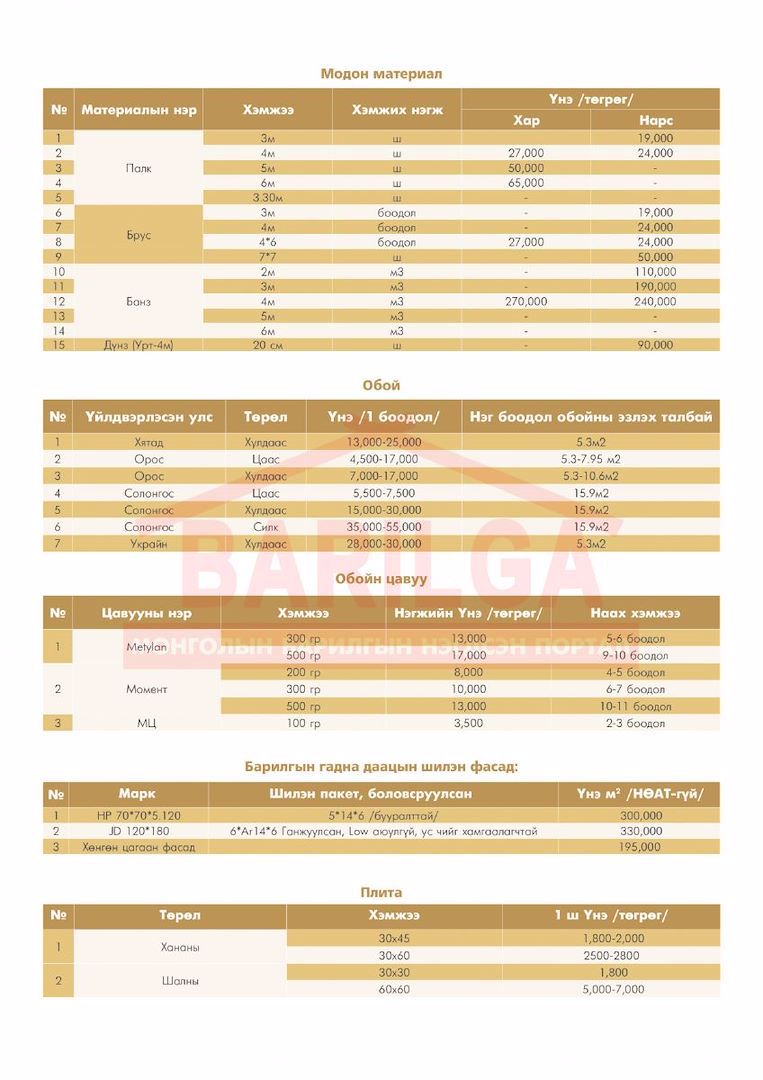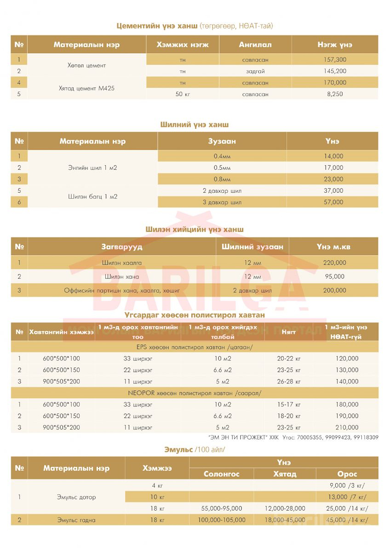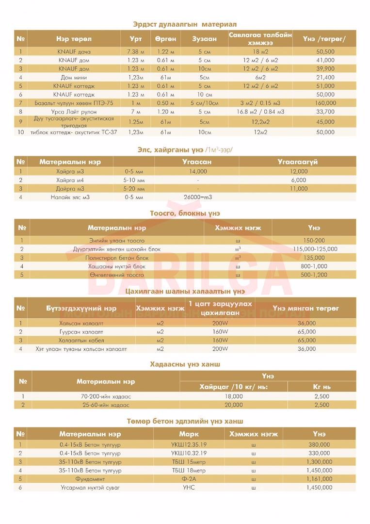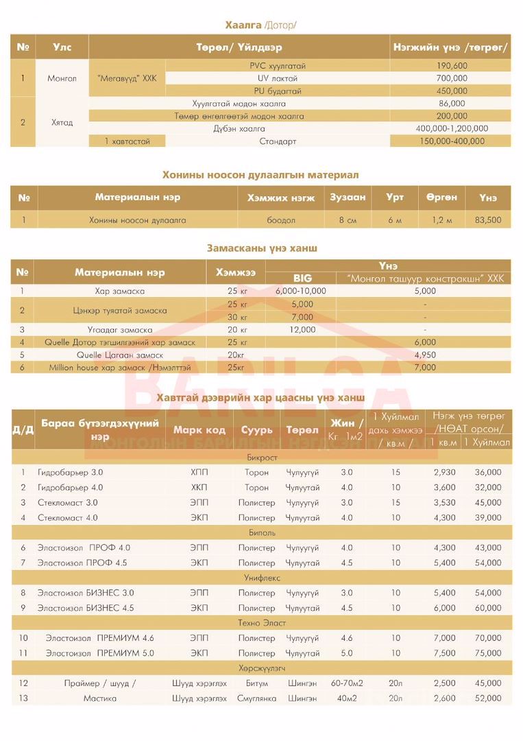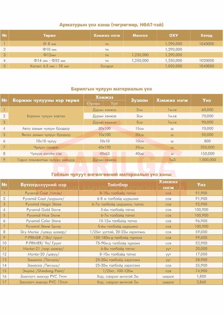 "Барилга.МН" сэтгүүлээс сар бүр хүргэдэг барилгын материалын үнэ ханшийн мэдээллийг уншигч танд хүргэж байна. Илүү дэлгэрэнгүй мэдээлэл авахыг хүсвэл манай сэтгүүлийн 11-р сарын дугаар №79-с үзэх боломжтой. "Барилга.МН" сэтгүүлийг "Номин" болон "Оргил" сүлжээ дэлгүүрийн салбарууд, номын дэлгүүрүүд, сонин сэтгүүл борлуулах цэгүүдээс худалдан аваарай. Доорх үнэ ханш нь 11-р сарын 25-ны өдрийн байдлаар болохыг анхаарна уу.
