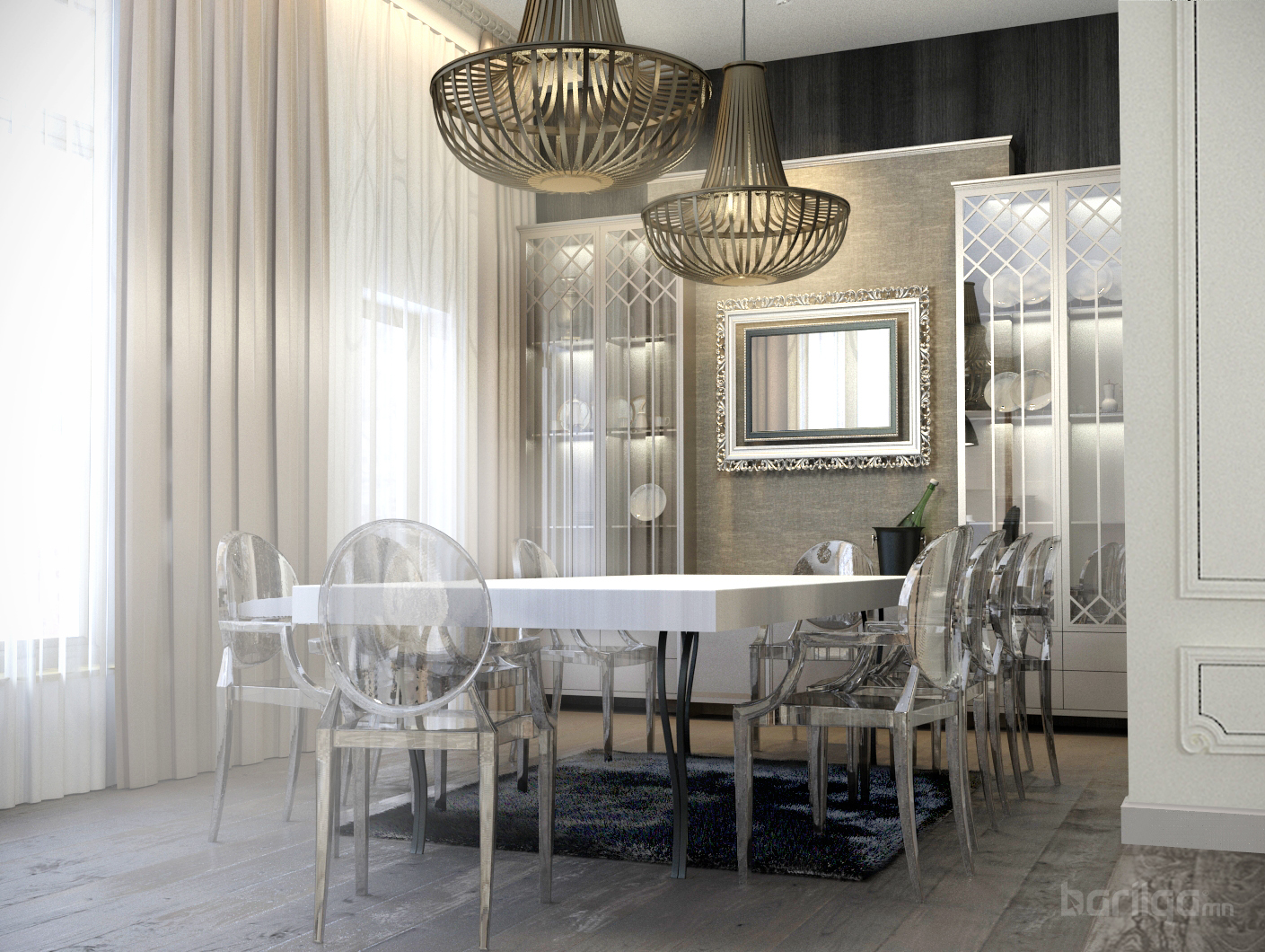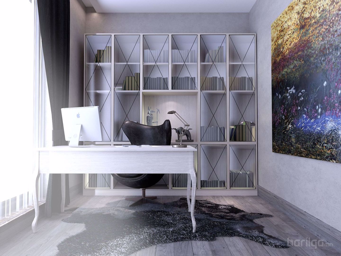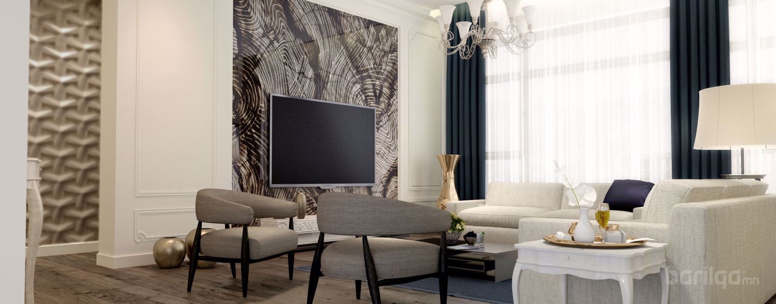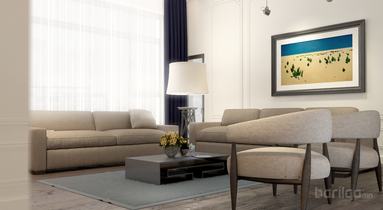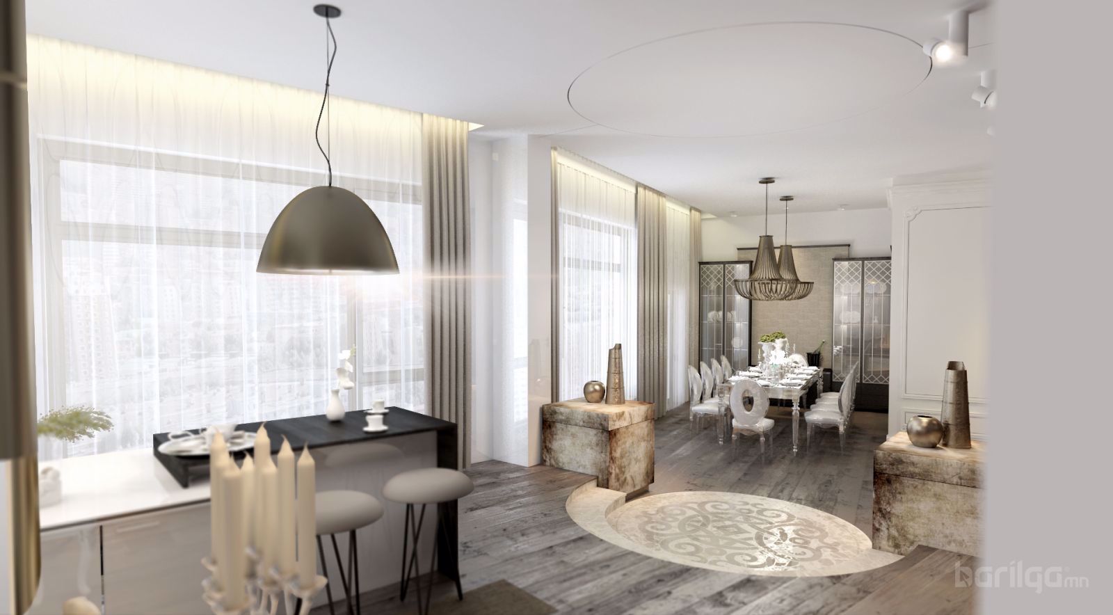 Зочны өрөөнд классик хийцлэлийн ханын молдны буланд угалз хээг шингээж, болон алхан хээг цайны ширээний шийдэл болгон урласан. Ингэснээрээ модерн классик стиль үндэсний хэв шинжийг агуулсан элемент хээ зэргийг багахан шингээж, тансаг зэрэглэлийг харуулж чадсан юм.