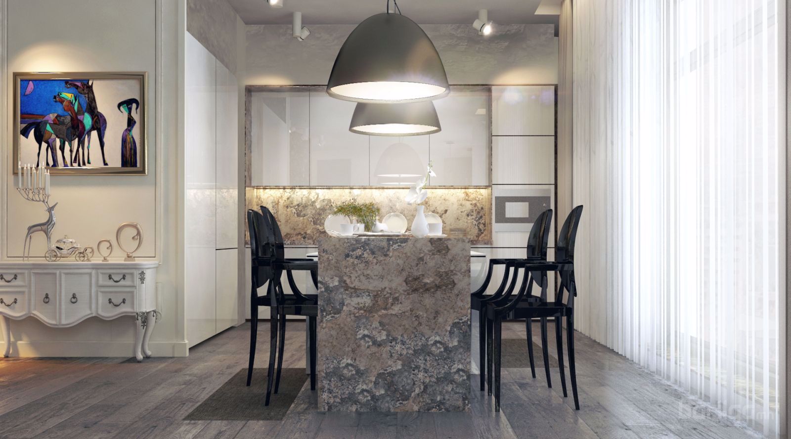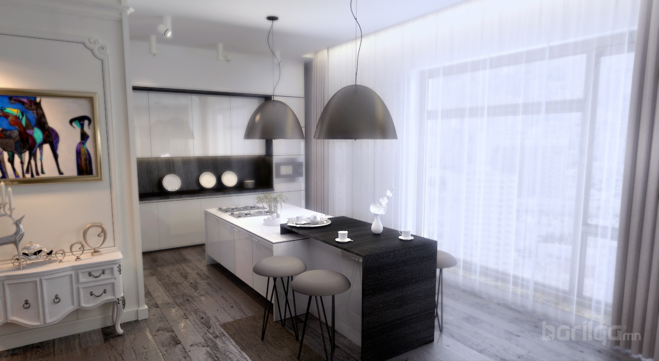 Зочны өрөөнөөс гэр бүлийн амралтын хэсэг рүү дамжин өнгөрөх хэсэгт хооллох ширээ байрлах ба гал тогооны хэсгийн шалны түвшинг өндөрлөж, шалны чулуунд тойрог хэлбэрийн угалз хээг шигтгэж өгсөн.