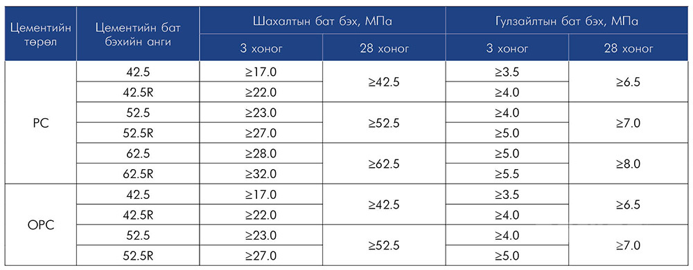 - Портландцемент ОРС 15 42.5 MNS 974 : 2008 гэсэн тэмдэглэгээг “Ердийн бэхжилттэй 15 хувийн идэвхт эрдэс нэмэлттэй, 42.5 ангийн портландцемент”,