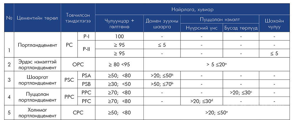 Эдгээр цементийн бүрдүүлэгч орцыг хүснэгтээр харуулбал: