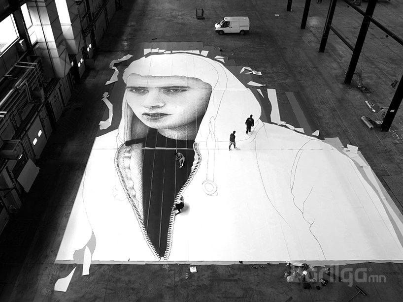 Дараа нь зургаа тухайн архитектурын хэв маягт тохируулан том хэмжээний форматаар сканердана. Эцэст нь наалдамхай бодис ашиглан барилга дээр наадаг.