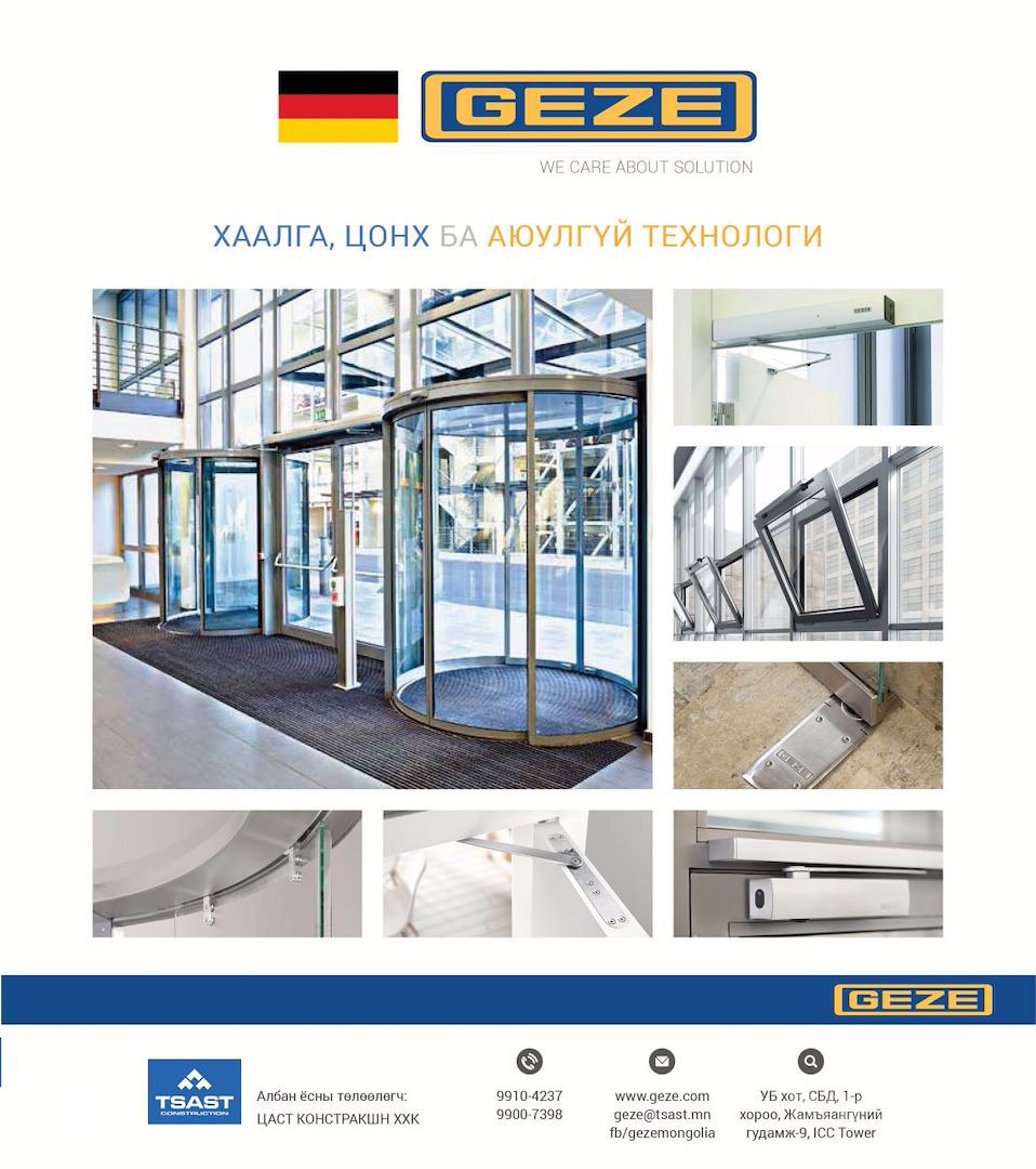 Барилга бүтээцэд хаалга, цонх томоохон үүрэгтэй байдаг билээ. Хүнээр төсөөлүүлэхэд нүд, чих, амны үүрэг гүйцэтгэдэг гэж хэлж болох юм. Сүүлийн үеийн хаалга, цонх автоматжиж, гүйдэг, эргэлддэг, энгийн хавтаст зэрэг загвар дизайны өргөн сонголттой болсон. Эдгээр нь орчин үеийн шинэлэг тоног төхөөрөмжид тулгуурлан, өндөр үзүүлэлттэй хөдөлгүүр бүхий технологиор хийгдэж, аюулгүй байдлыг өндөр түвшинд хангаж байна. Энэхүү хөгжил дэвшилnийн гол төлөөлөгч болсон БНГУ-ын 150 жилийн түүхтэй “GEZE” брэндийн хаалганы системийг танилцуулж байна.