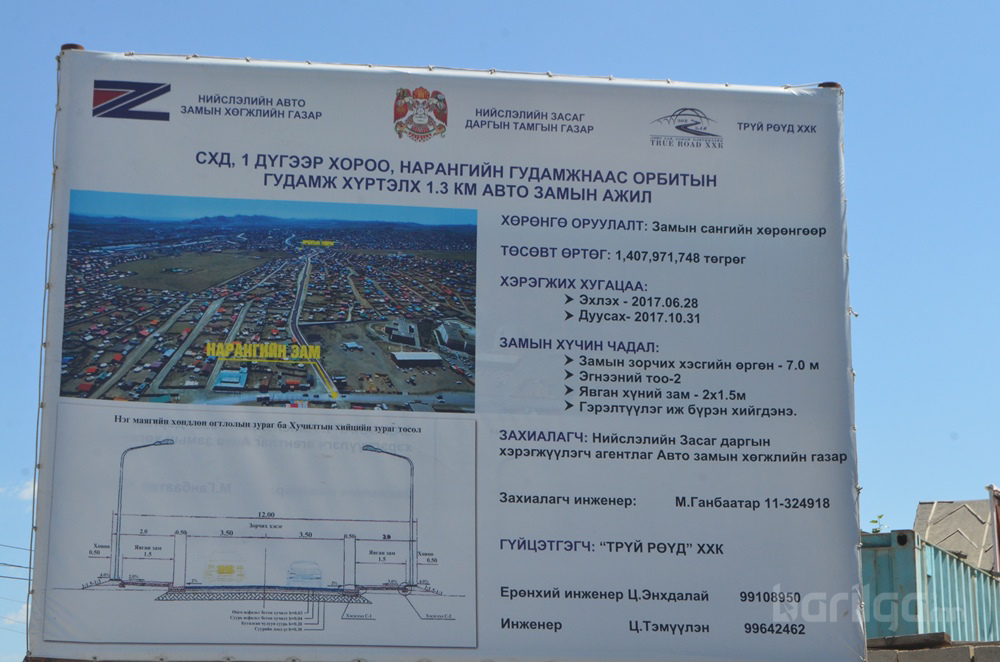 Энэ онд нийт 15 авто зам шинээр тавигдаж байна. Үүний нэг болох Сонгинохайрхан дүүргийн Нарангийн гудамжнаас Орбитын гудамж хүртэлх 1,3 авто замын ажил энэ сарын 21-ний өдрөөс эхэлсэн бөгөөд Зөв зам ХХК төсөл хэрэгжүүлэгч компаниар шалгаран ажиллаж байна. 11 сард ашиглалтад орох тус зам нь 7 метрийн өргөнтэй, хоёр талдаа 1,5 метр явган хүний замтай, гэрэлтүүлгийг бүрэн шийдсэн байх аж. Замын ажлын явц 30 орчим хувьтай үргэлжилж байна.