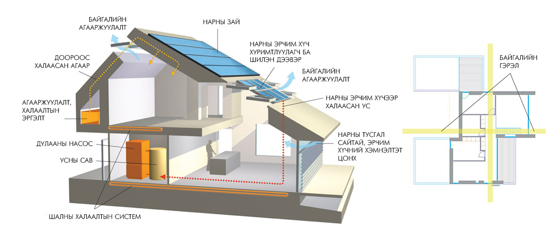 - Барилгын цахилгааны ачааллыг бууруулах буюу аль болох эрчим хүчний хэмнэлттэй тоног төхөөрөмжүүдийг ашиглах. Энэ нь анхны хөрөнгө оруулалтын хэмжээг бууруулна.