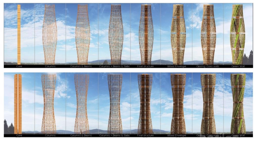 “Native Skyscraper” барилгын төлөвлөлт нь мушгиран дээшилж буй хэлбэртэй. Ногоон багануудыг мод болон шилэн фасадаар холбожээ. Дизайны багийнхан энэхүү ногоон барилгадаа барилгын үндсэн материал болох модыг ашиглаад зогсохгүй эргэн тойрны цамхгуудтай холбохыг зорьжээ. “Мод бол байгаль эхийн нэгэн гайхалтай бүтээл. Энэ нь бидний бүтээлийг байгаль орчинтой шууд холбож өгч байгаа юм. Хорвоо дэлхий дээр яг адилхан хоёр мод огт байдаггүй шүү дээ” хэмээн архитекторууд нь өгүүлжээ.