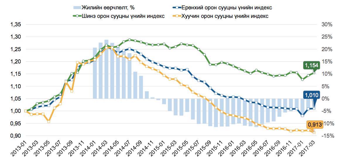 “2012 онд нэг метр квадратын үнэ нь дунджаар нэг сая 650 мянган төгрөгийн ханштай байсан бол 2014 оны гуравдугаар сар гэхэд дунджаар хоёр сая 40 мянган төгрөг болж огцом өсчээ. Үүнээс хойш үнэ хэдий буурсан ч .”