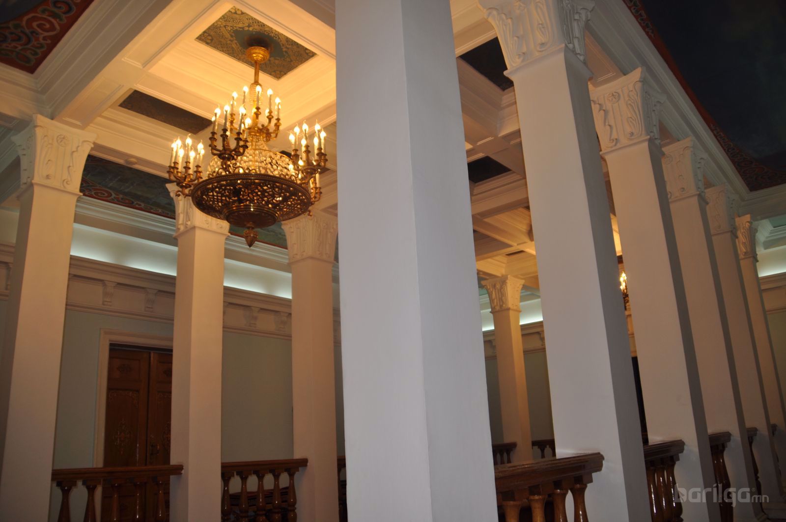 Гол шатны хоёрдугаар давхрын гурван талыг баганат галерей, хайсаар чимж, таазыг дагнаас гарган хээлсэн угалз бүхий хүрээ дотор Монгол орны дөрвөн улирлын байгалийн байдлыг тухайн улирлын онцлог үйл явдлыг дүрсэлсэн уран зургаар чимжээ. Тухайлбал, зуны улирлын зурагт эрийн гурван наадмыг дүрсэлсэн бол намрын зурагт хадлангийн ажлыг, өвлийн зурагт өвөлжөө, дөн өвлийн хүйтэнд ачаа тээхээр явж буй тэмээ жингийн цувааг дүрсэлсэн бол хаврын зурагт цас мөс хайлж, хүн малын зоо тэнийсэн байдлыг хоньчин бүсгүйгээр төлөөлөн үзүүлснийг харж болно.