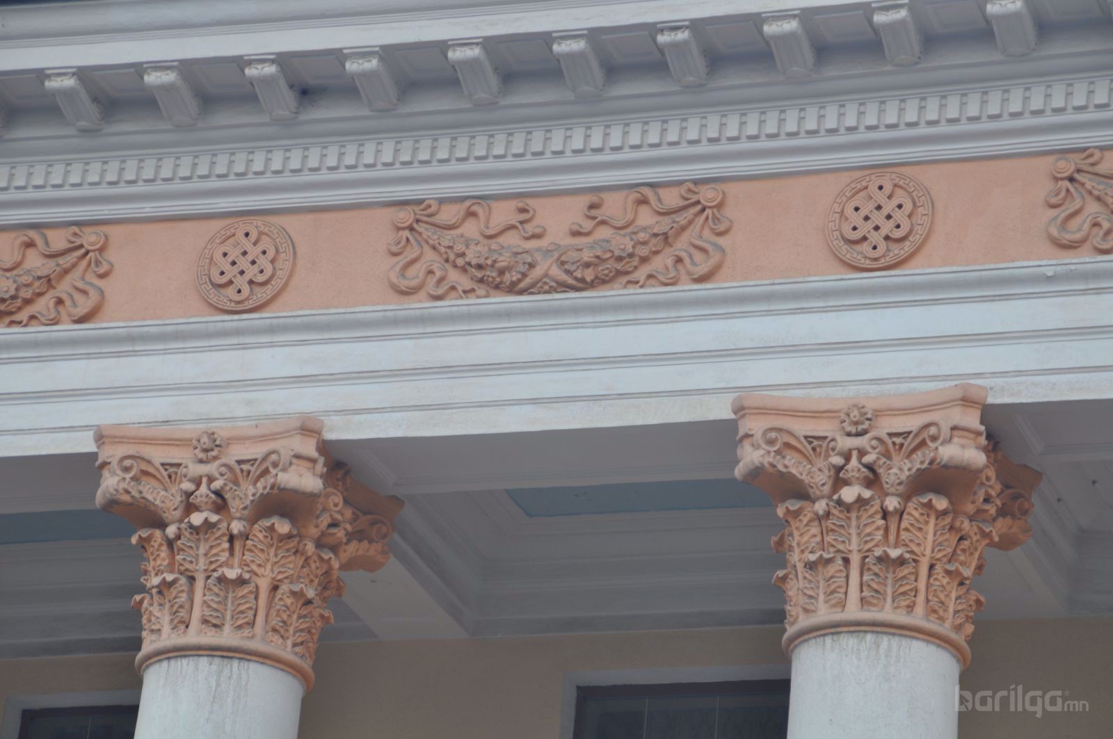 Барилгын архитектур. Маршалын өргөө нь архитектурын хувьд неоклассизмын төлөөлөл бөгөөд интерьер нь үндэсний хэв маягтай болно. Энэхүү барилгын дотоод чимэглэл буюу мөг (карниз)-ийн хээ угалз, таазны зураг, хээ, хийц хэсэглэл, баганын толгойн чимэглэл, гадна чимэглэл, уран баримал зэргийг урлан бүтээхэд тухайн үеийн Монголын шилдэг зураач, уран барималч, сийлбэрчид тухайлбал, Д.Чойдог, Д.Маньбадар, О.Цэвэгжав, Ү.Ядамсүрэн, Д.Лувсанжамц, С.Чоймбол, Н.Жамбаа, Д.Данзан, н.Чойгоо, П.Доржготов, Б.Гэлэгдандар, Д.Гэвшээхүү зэрэг урчууд оролцож, өөрсдийн оюун ухаан, уран гараар сор бүтээл хийсэн нь бидний үед мөнхрөн үлдсэн юм.