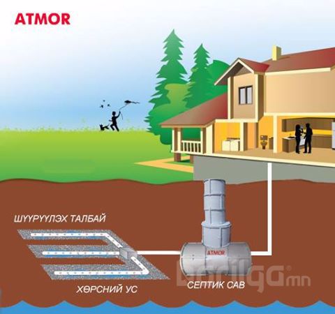 - Бохирыг халдваргүйжүүлж, шүүрүүлэх талбайгаар хөрс рүү саарал усыг шингээх технологи (Зөвхөн лаг, хатуулаг танканд тунаж үлдэх тул дундаж усны хэрэглээтэй өрх 3-4 жилд ганц соруулна)