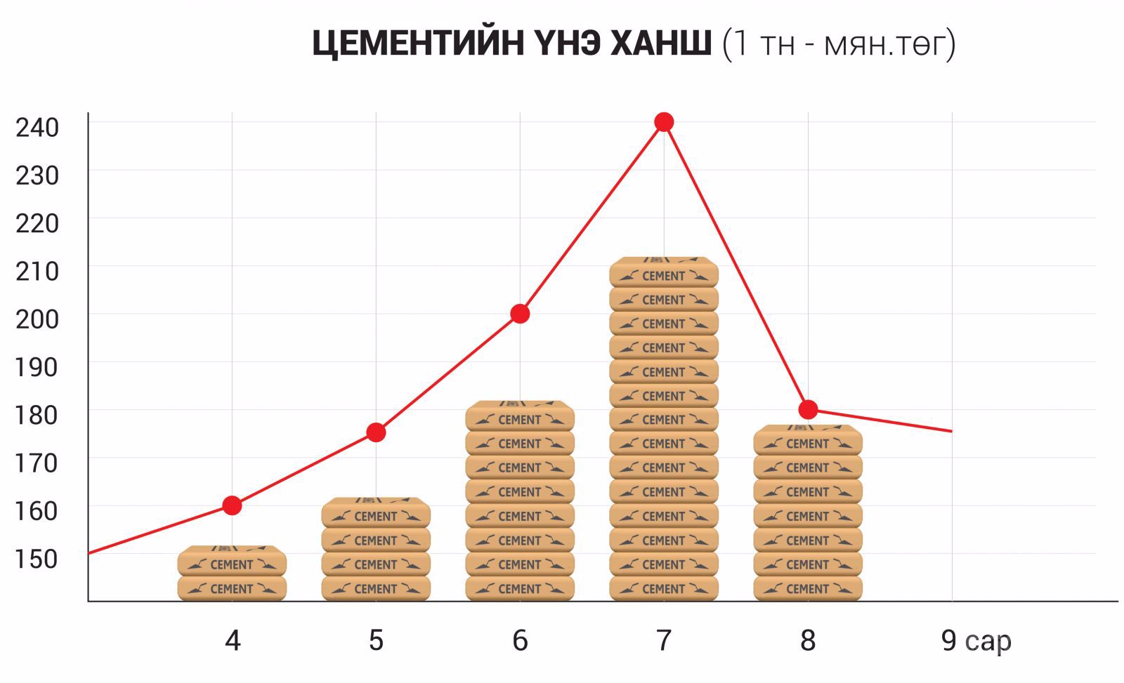 өсч 1 тонн нь 250,000 төгрөгт хүрч салбарынхныг нэлээд сандаргаж байсан. Харин 8 дугаар сараас хойш үнэ буурч, харьцангуй тогтворжиж эхлээд байна. Үнэ нэмэгдсэн гол шалтгаан нь “Хөтөл”, “Налгар Түшиг” үйлдвэрүүд түр зогсож, төмөр замаар бусад үйлдвэрүүдээс цемент орж ирэхгүй саатсанаас болж хомсдол үүссэнтэй холбоотой гэж мэргэжлийн хүмүүс тайлбарлалаа.