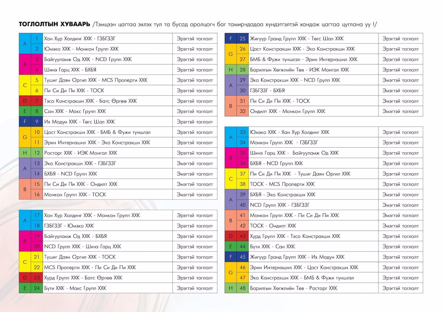 Тэмцээнд нийт 30 байгууллагын эрэгтэй 28 баг, эмэгтэй 8 баг оролцоно. Хэсгээс гарсан эрэгтэй тоглолт нь 8 минутаар хоёр үе тоглож, 2-р үеийн сүүлийн 2 минут нь цэвэр цагаар явах бөгөөд довтолгооны 24 секунд харна. Харин эмэгтэй тоглолт нь 7 минутаар хоёр үе үргэлжилж, 2-р үеийн сүүлийн 2 минут нь мөн ижил цэвэр цагаар бодогдож, довтолгооны 24 секундыг харна. Баг тамирчид хуваарьт тоглолт болох цагтаа ирээгүй тохиолдолд 5 минут хүлээх бөгөөд дээрх хугацаанд амжиж ирээгүй бол тухайн тоглолтод хожигдсоноор тооцно.