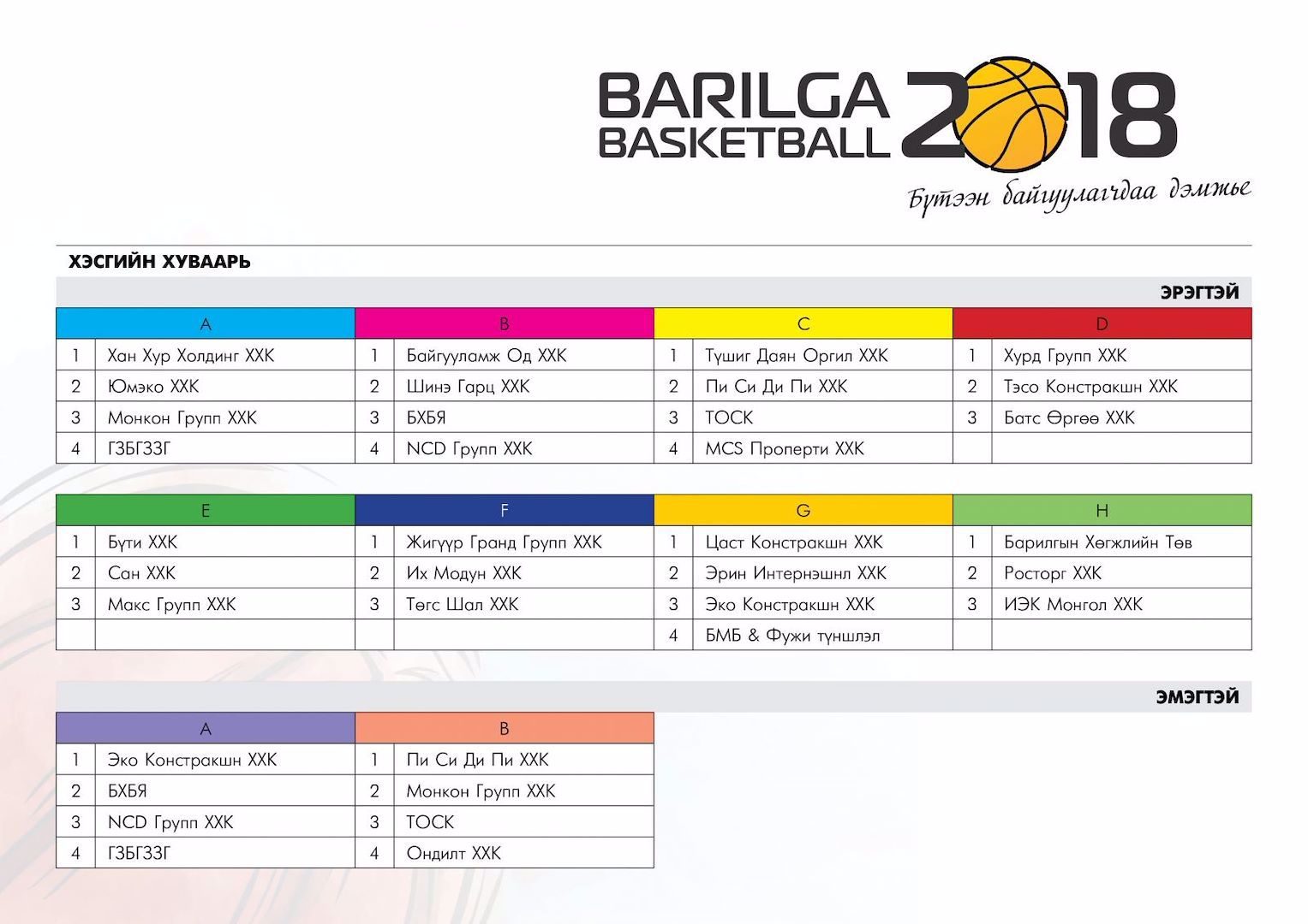 “BARILGA BASKETBALL 2018” тэмцээн жил ирэх тусам хүрээгээ тэлж, оролцогч багуудын тоо нэмэгдэж, нийт дор дурдсан 30 байгууллагын эрэгтэй 28 баг, эмэгтэй найман багтайгаар үргэлжилж байна.