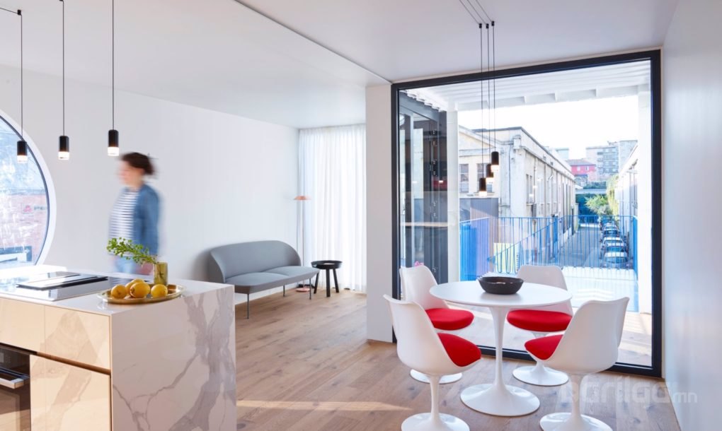 Тус бүр засч янзалсан гурван чингэлгээр хоёр давхар сууц босгожээ. Том цонхнуудтай, өнгөлөгч хана, гадна засал нь чингэлгийг үзэмжтэй, гоёмсог харагдуулж байгаа юм. Орчин үеийн шийдлийг дотор засалд ч мөн тусгаж, байгалийн гэрэлтүүлгийг чөлөөтэй нэвтрүүлэх таатай орон зайг шийдэж, тохилог тавилгуудыг байрлуулжээ. Энэ нь ердийн ган төмөр чингэлгийг гоёмсог, тухтай сууц болгосон гайхалтай сайн жишээ болж чадсан байна.