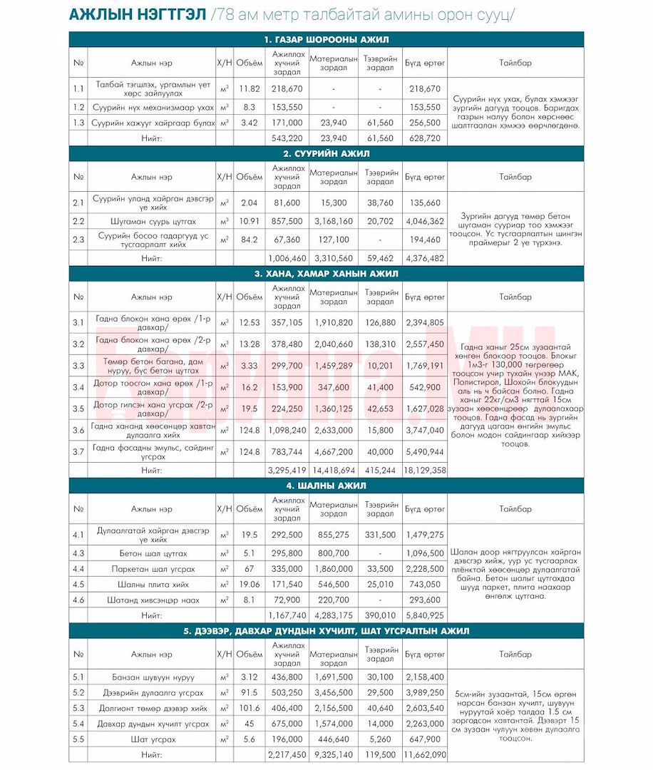 Айл өрх бүр хашаандаа, эзэмшил газар дээрээ өөрийн гэсэн тохилог амины орон сууцтай болж, тав тухтай амьдрах таатай орчноо бүрдүүлэхийг хүсч явдаг биз ээ. Харин хэрхэн, яаж ийм сууцтай болох талаар мэдлэг, мэдээлэл дутмаг байдгаас хүссэн сууцаа бариулж чаддаггүй нь олонтаа. Ялангуяа хэтэвчнийхээ хэмжээнд тааруулан боломжийн байшинтай болох гэсэн иргэддээ зориулан тэдний нийтлэг сонирхдог 78 ам метр талбайтай амины сууцны төсөв өртгийг Барилгын инженер Ө.Содбаатартай хамтран бэлтгэлээ.