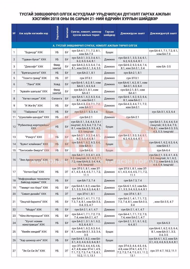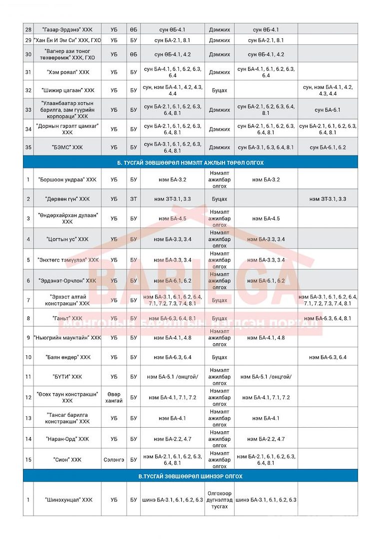 - Тусгай зөвшөөрөл сунгах, нэмэлт ажлын төрөл олгох чиглэлээр 35