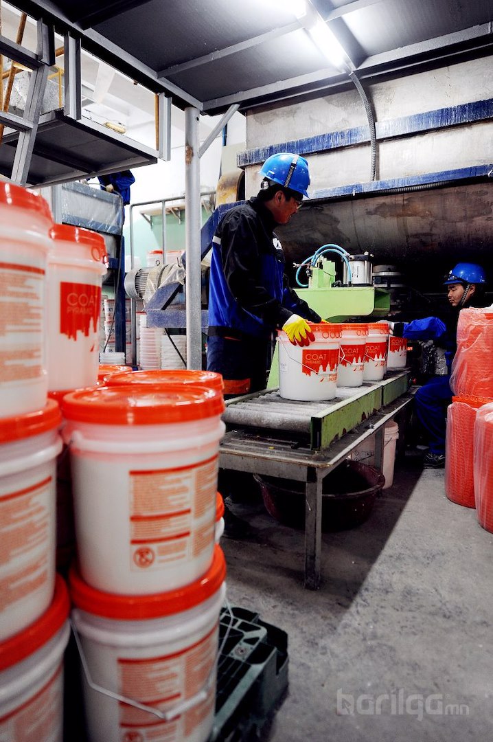 Үүний дараа “чулуут өнгөлгөөний материал”-ын үйлдвэртэй танилцлаа. Тус үйлдвэр нь хоногт 1000 ширхэг сав бүтээгдэхүүн үйлдвэрлэх хүчин чадалтай бөгөөд бүх төрлийн чулуут өнгөлгөөний материалыг хэрэглэгчийн хүссэн өнгөөр үйлдвэрлэхээс гадна Монгол орны эрс тэс цаг уурт зохицуулан хавар намрын сэрүүн нөхцөлд ч барилгын ажлын чанарт нөлөөлөхгүйгээр хэрэглэж болох тусгай орц найрлагаар үйлдвэрлэх боломжтойгоороо онцлог гэнэ. Нэг сав нь 24кг савлагаатай, 10 төрлийн чулуут өнгөлгөөг үйлдвэрлэнэ. Гол орц болох байгалийн чулууг БНХАУ болон БНСУ-аас нийлүүлдэг. Өнгөний хувьд хэрэглэгчийн хүссэн 100 гаруй төрлийн өнгийг гаргадаг ажээ.