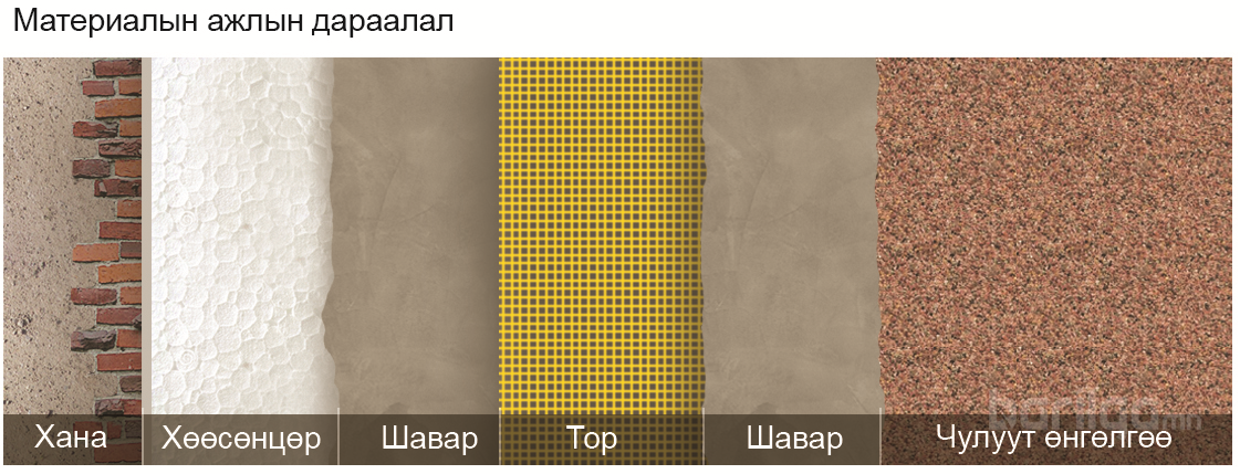 Материалаа үйлдвэрлэх дөрвөн тогоотой. Энэ бүтээгдэхүүн нь хөөсөнцрийг бодвол илүү олон, арваад төрлийн шат дамжлагаар дамждаг юм байна. Товчхондоо, эхлээд чулууг тусгай найрлагатай цавуутай хамтатган тогоондоо хийн, хутгана. Хамгийн сүүлд өнгө гаргалт хийгддэг байна.