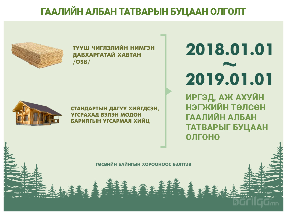 Гаалийн албан татвараас чөлөөлөх тухай хуулийг дагаж мөрдөх журмын тухай хуулийг мөн баталлаа. Энэ хуулиар 2018 оны 01 дүгээр сарын 01-ний өдрөөс 2019 оны 01 дүгээр сарын 01-ний өдрийг хүртэлх хугацаанд импортоор оруулсан тууш чиглэлийн нимгэн давхаргатай хавтан /OSB/, стандартын дагуу хийгдсэн, угсрахад бэлэн модон барилгын угсармал хийцэд ногдуулсан гаалийн албан татварыг буцаан олгохоор боллоо. Буцаан олгох заалтыг Нэмэгдсэн өртгийн албан татвараас чөлөөлөх тухай хууль хүчин төгөлдөр болсон өдрөөс эхлэн дагаж мөрдөнө.
