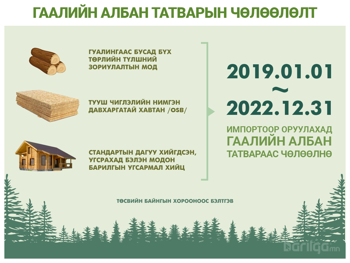 Төрөөс ойн талаар баримтлах бодлогын зорилтыг хэрэгжүүлэх, ойн санг нэмэгдүүлэх, мод, модон материалын хэрэгцээг импортын модоор хангах зорилгоор импортоор оруулж байгаа гуалингаас бусад түлшний зориулалтын мод, тууш чиглэлийн нимгэн давхаргатай хавтан /OSB/, стандартын дагуу хийгдсэн, угсрахад бэлэн модон барилгын угсармал хийцийг гаалийн албан татвараас 2022 оны 12 дугаар сарын 31-нийг өдөр хүртэлх хугацаанд чөлөөлөхөөр боллоо.