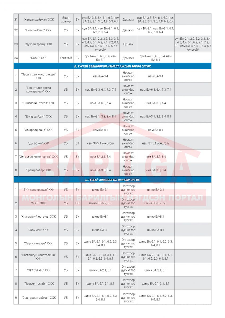 Уг ажлын хүрээнд Барилгын ажил гүйцэтгэх тусгай зөвшөөрлийн асуудлаар урьдчилсан дүгнэлт гаргах Ажлын хэсгийнхэн 2018 оны 5-р сарын 2-ны өдөр хуралдаж, 87 аж ахуйн нэгж, байгууллагын тусгай зөвшөөрөл сунгах, нэмэлт, шинээр авах хүсэлтийг шийдвэрлэжээ.