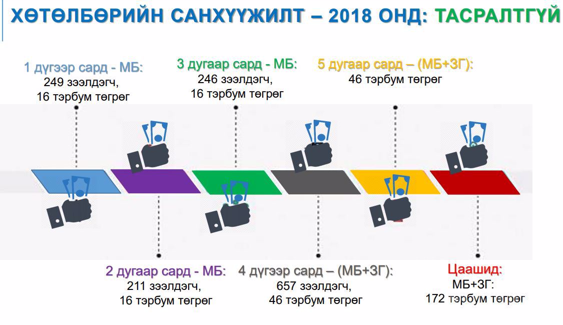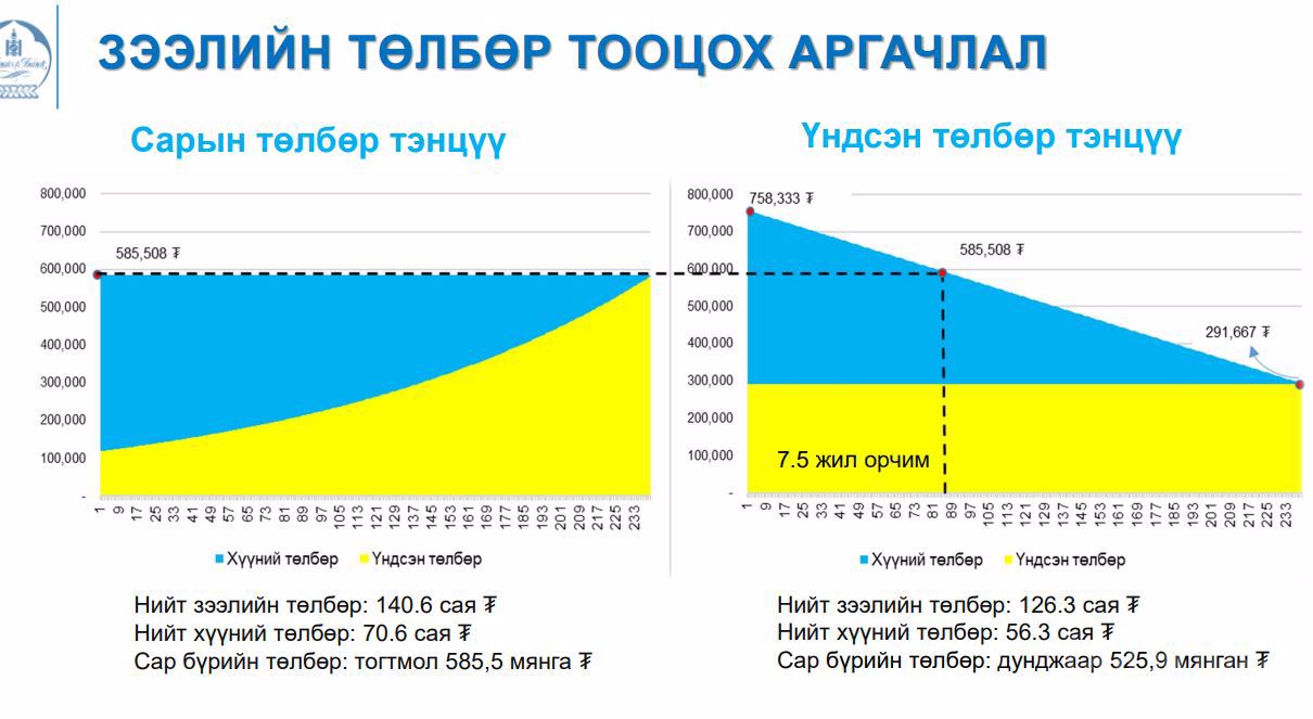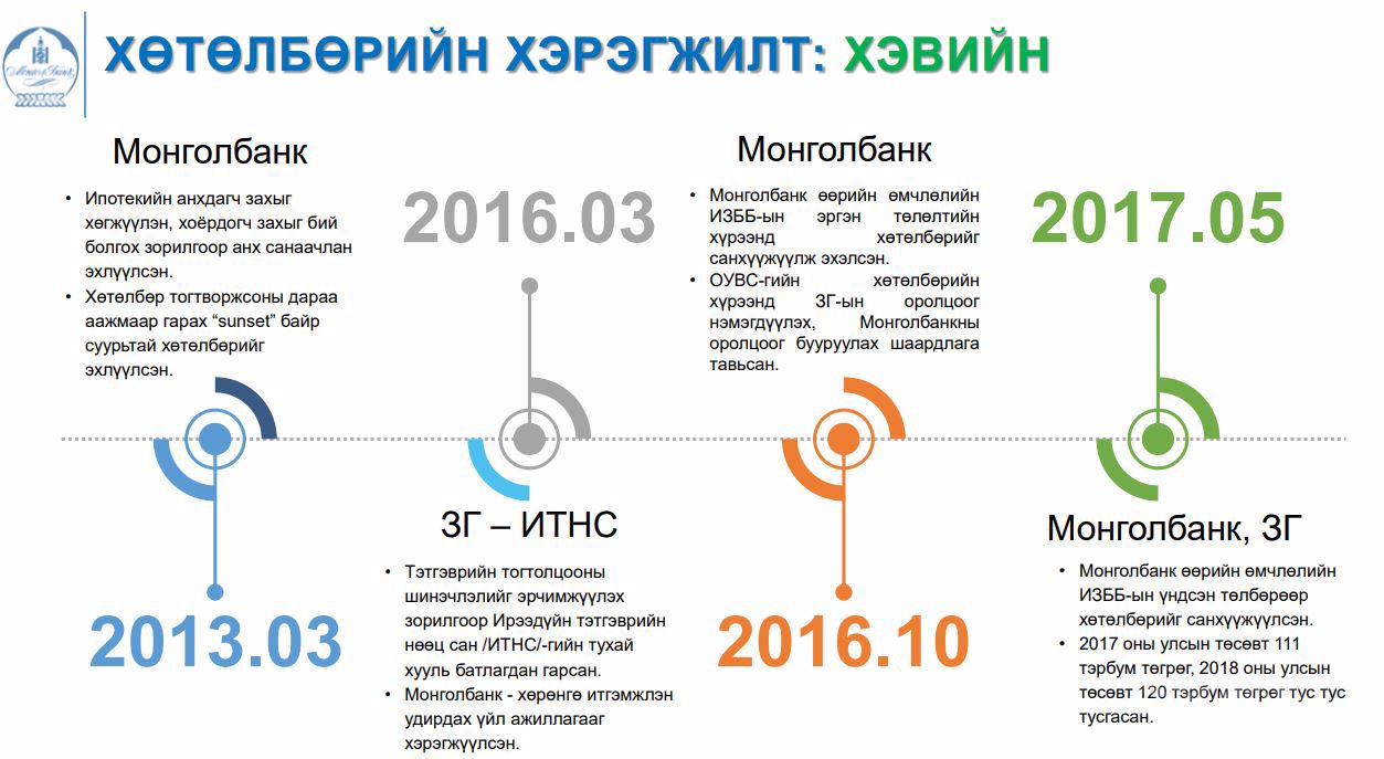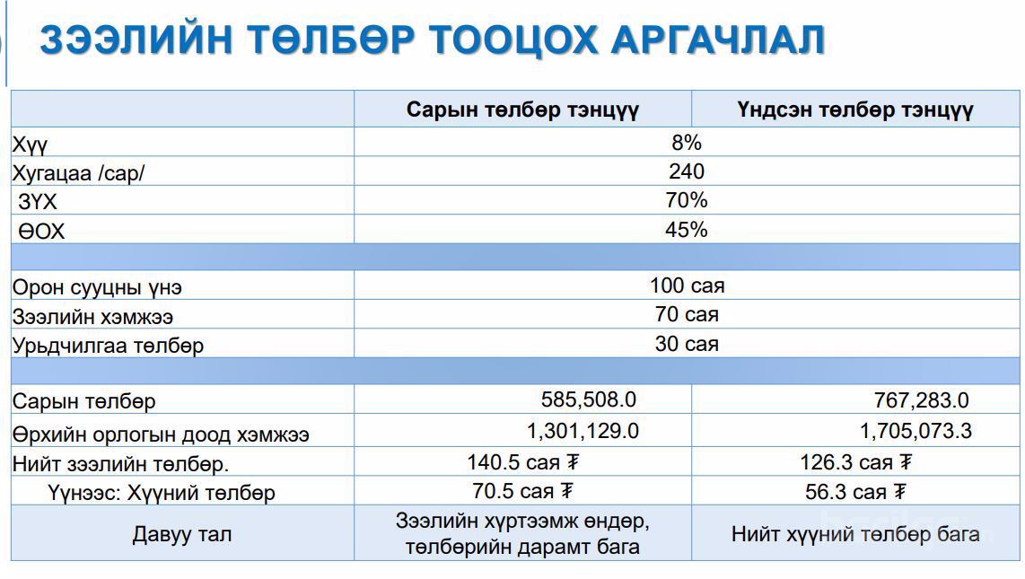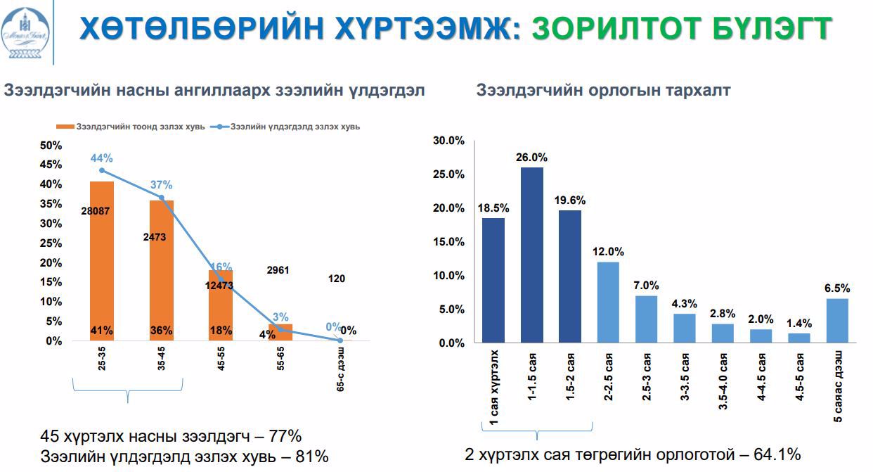 2018 оны эхний улиралд 93.3 тэрбум төгрөгийн ИПОТЕКИЙН ЗЭЭЛ олгожээ. Цаашид Засгийн газар болон Монголбанкны хамтарсан санхүүжилт буюу 172 тэрбум төгрөгний зээл олгохоор ажиллаж байна. Зээлдэгчдийн 60 гаруй хувь нь 2 хүртэлх сая төгрөгний орлоготой байна.