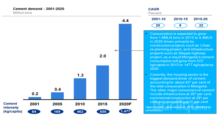 2013 онд хийсэн МакКинзи компанийн судалгаагаар 100 мянган айлыг орон сууцжуулах төсөл, нийслэлийн дахин төлөвлөлт, 7000 км талын зам барих зэрэг томоохон төслүүдийн цементийн хэрэгцээ жилд 22 хувиар өссөөр 2020 онд 4.4 сая тонн болно гэж тооцжээ.