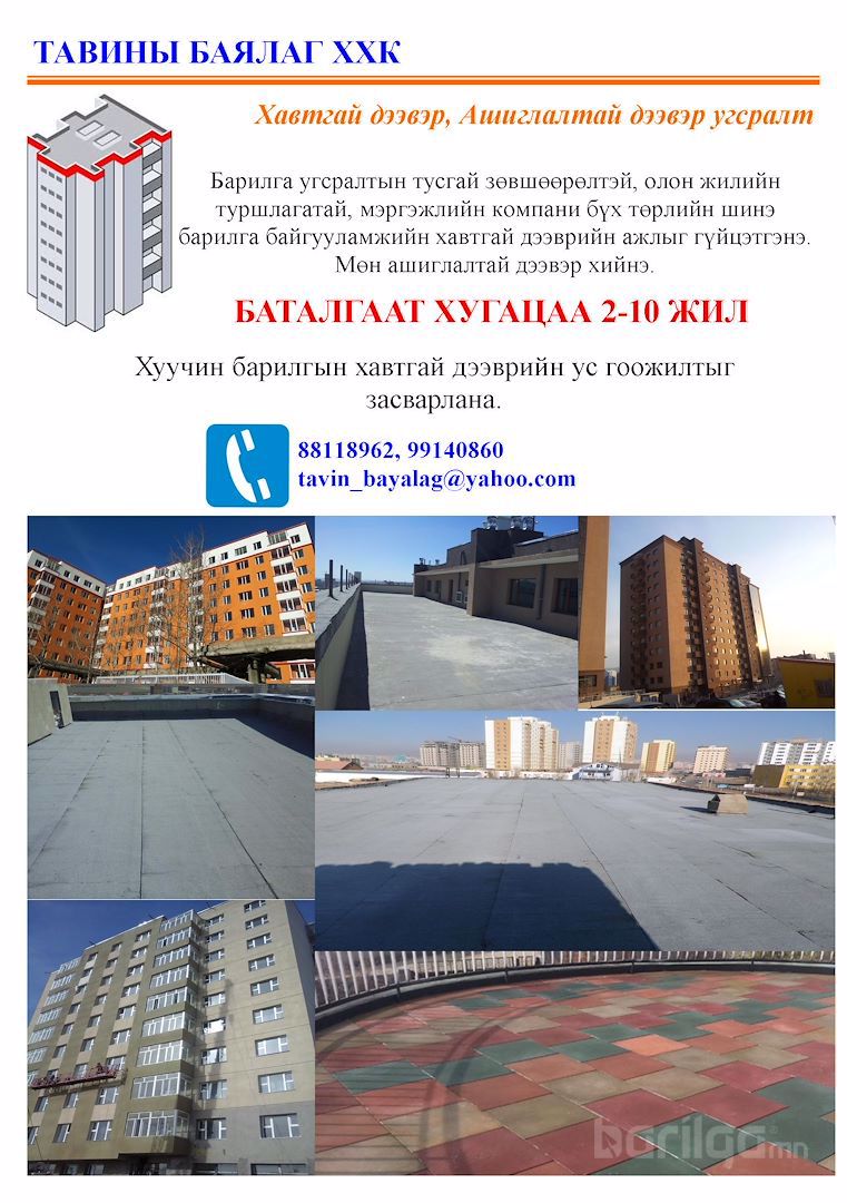 Шинэ барилга байгууламжийн хавтгай дээврийг угсрах ажил болон хуучин барилгын хавтгай дээврийн ус гоожилтыг оношлож , чанартай засварлах ажлыг Технониколийн рулонон хайлуулдаг чанар сайтай, материалын насжилт, эдэлгээ өндөртэй материал ашиглан гүйцэтгэнэ. Мөн дараах ажлуудыг хэсэгчлэн гүйцэтгэнэ.Үүнд: